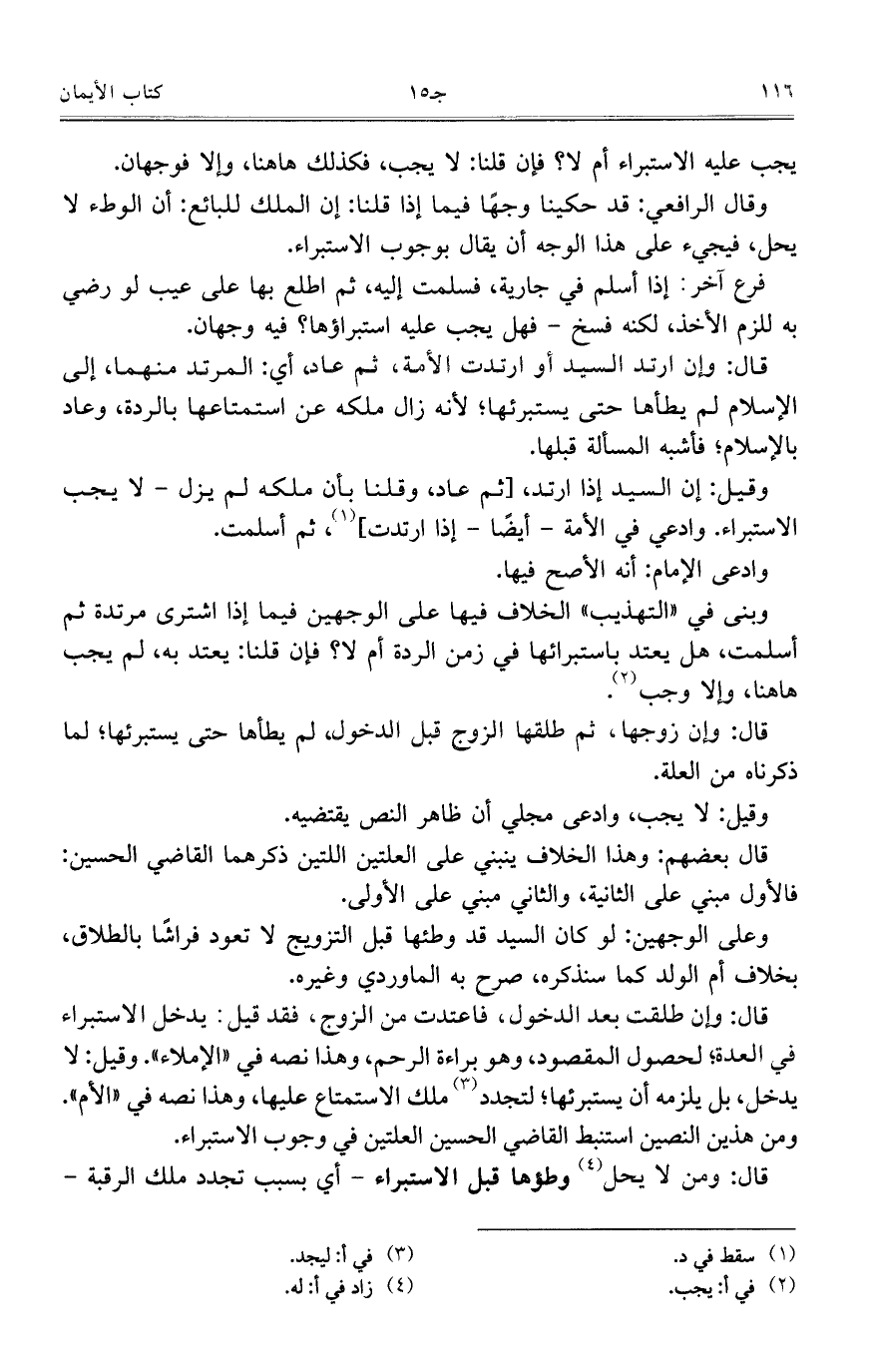 وقيل: إن السيد إذا ارتد، [ثم عاد، وقلنا بأن ملكه لم يزل- لا يجب الاستبراء. وادعي في الأمة- أيضاً- إذا ارتدت]، ثم أسلمت.