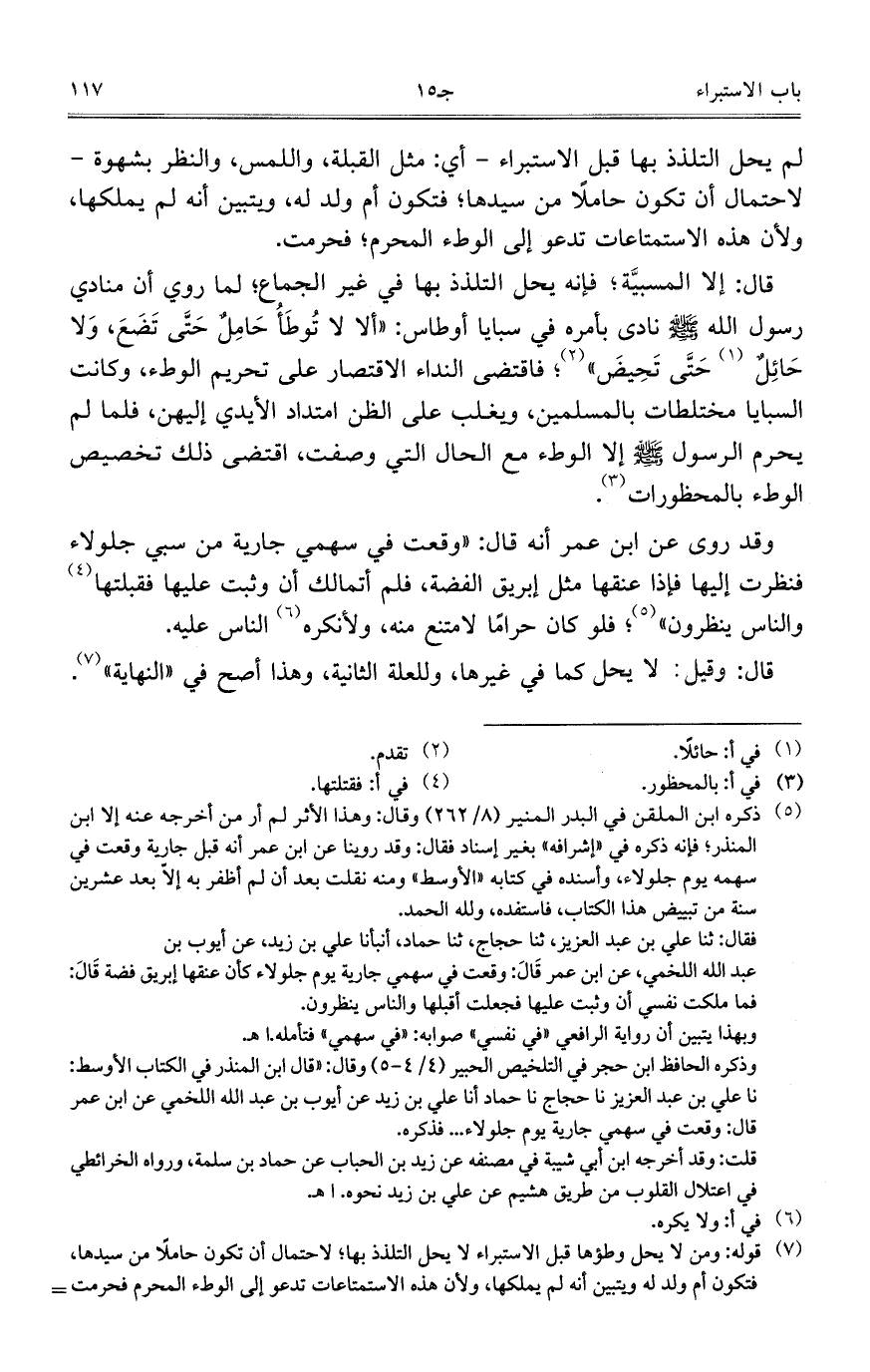 وقد روى ابن عمر أنه قال: "وقعت في سهمي جارية منس بي جلولاء فنظرت إليها فإذا عنقها مثل إبريق الفضة، فلم أتمالك أن وثبت عليها فقبلتها والناس ينظرون"؛ فلو كان حراماً لامتنع منه، ولأنكره الناس عليه.
