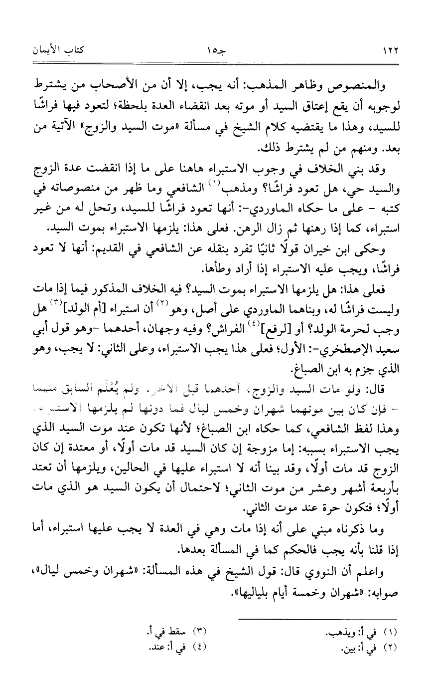 والمنصوص وظاهر المذهب: أنه يجب، إلا أن من الأصحاب من يشترط لوجوبه أن يقع إعتاق السيد أو موته بعد انقضاء العدة بلحظة؛ لتعود فيها فراشاً للسيد، وهذا ما يقتضيه كلام الشيخ في مسألة "موت السيد والزوج" الآتية من بعد. ومنهم من لم يشترط ذلك.