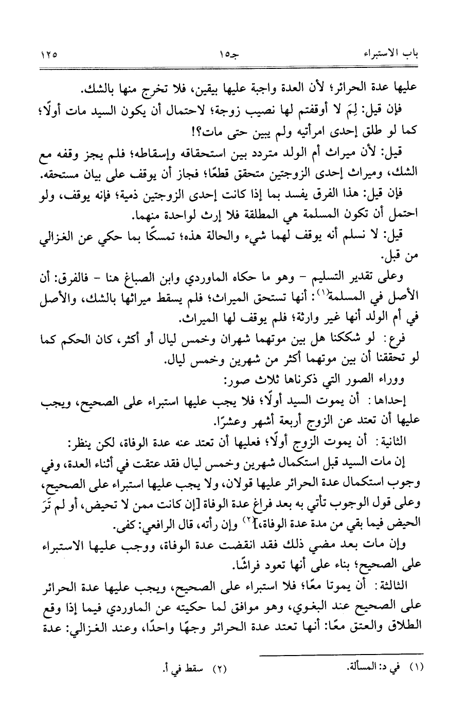 وعلى تقدير التسليم- وهو ما حكاه الماوردي وابن الصباغ هنا- فالفرق: أن الأصل في المسلمة: أنها تستحق الميراث؛ فلم يسقط ميراثها بالشك، والأصل في أم الولد أنها غير وارثة؛ فلم يوقف لها الميراث.