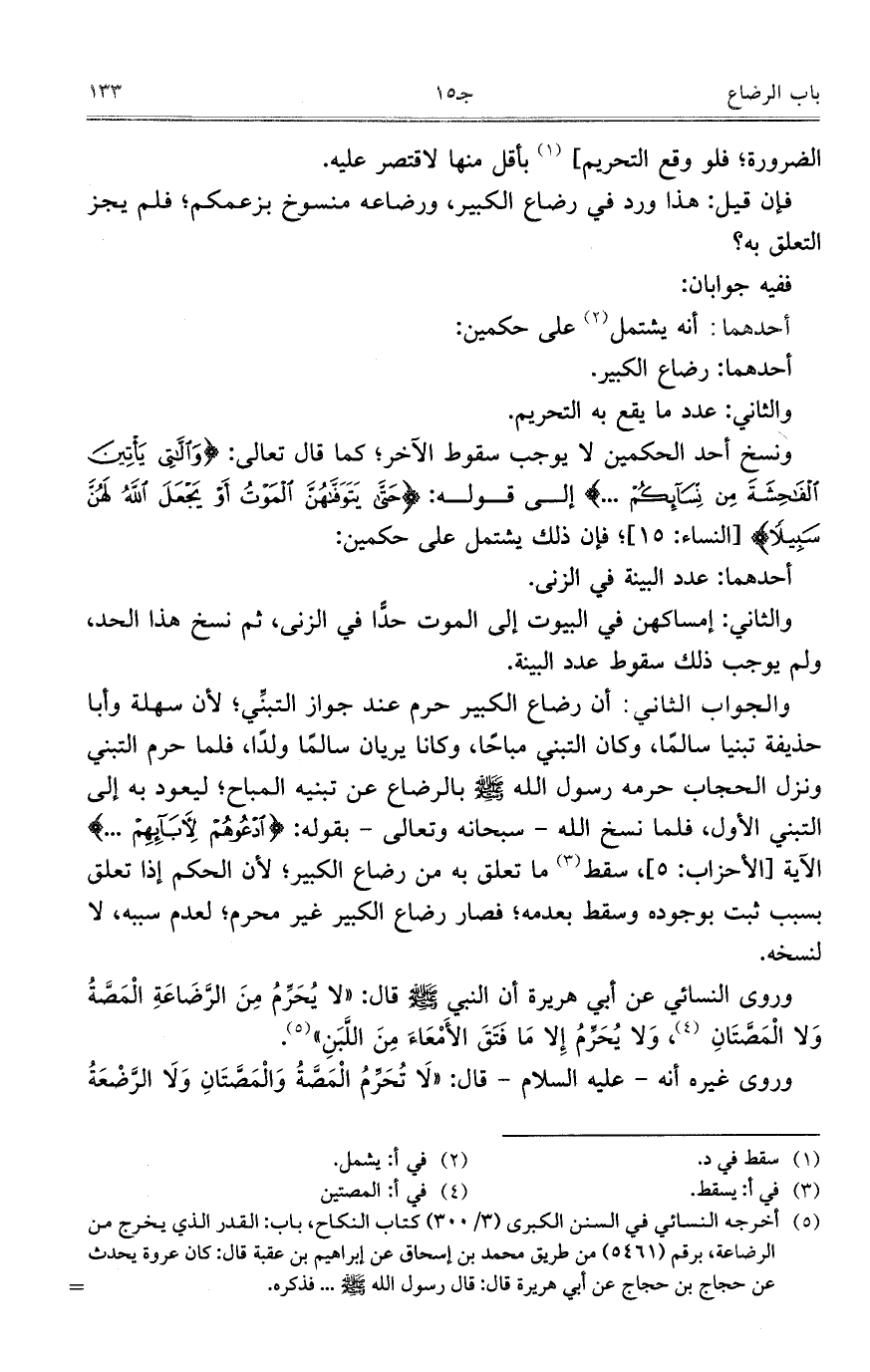 والجواب الثاني: أن رضاع الكبير حرم عند جواز التبني؛ لأن سهلة وأبا حذيفة تبنيا سالماً، وكان التبني مباحاً، وكانا يريان سالماً ولداً، فلما حرم التبني ونزل الحجاب حرمه رسول الله صلى الله عليه وسلم بالرضاع عن تبنيه المباح؛ ليعود به إلى التبني ألأول، فلما نسخ الله- سبحانه وتعالى- بقوله: {ادْعُوهُمْ لآبَائِهِمْ .....} الآية [الأحزاب: 5]، سقط ما تعلق به من رضاع الكبير؛ لأن الحكم إذا تعلق بسبب ثبت بوجوده وسقط بعدمه؛ فصار رضاع الكبير غير محرم؛ لعدم سببه، لا لنسخه.
