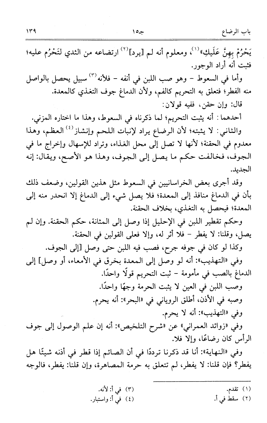 وقد أجرى بعض الخراسانيين في السعوط مثل هذين القولين، وضعف ذلك بأن في الدماغ منافذ إلى المعدة؛ فلا يصل شيء إلى الدماغ إلا انحدر منه إلى المعدة؛ فيحصل به التغذين بخلاف الحقنة.