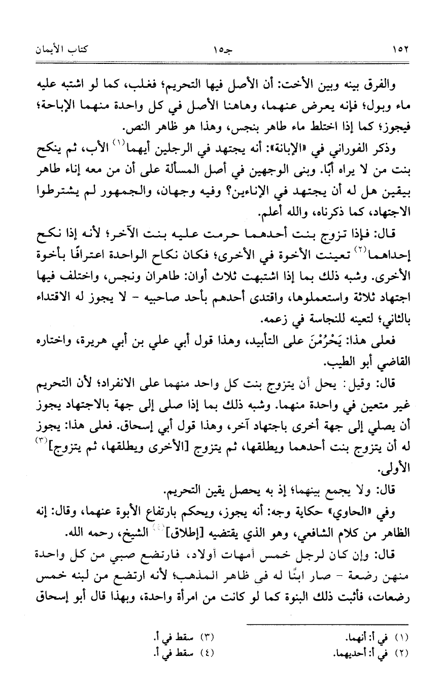 قال: وقيل: يحل أن يتزوج بنت كل واحد منهما على الانفراط؛ لأن التحريم غير متعين في واحدة منهما. وشبه ذلك بما إذا صلى إلى جهة بالاجتهاد يجوز أن يصلي إلى جهة أخرى باجتهاد آخر، وهذا قول أبي إسحاق. فعلى هذا: يجوز له أن يتزوج بنت أحدهماويطلقها، ثم يتزوج [الأخرى ويطلقها، ثم يتزوج] الأولى.