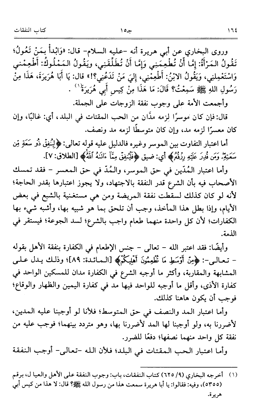 وروى البخاري عن أبي هريرة أنه- عليه السلام- قال: "وَابْدَا بِمَنْ تَعُولُ؛ تَقُولُ المَرْأَةُ: إِمَّا أَنْ تُطْعِمَنِي وَإِمَّا أَنْ تُطَلِّقَنِي، وَيَقُولُ المَمْلُوكُ: أَطْعِمْني وَاسْتَعْمِلنِي، وَيَقُولُ الابْنُ: أَطْعِمْنِي، إِلَي مَنْ تَدَعُنِي؟ " قَال: يَا أَبَا هُرَيرَةَ، هَذَا مِنْ رَسُولِ اللهِ صلى الله عليه وسلم سَمِعْتُ؟ قَالَ: مَا هَذَا مِنْ كِيسِ أَبِي هُرَيرَةَ.
