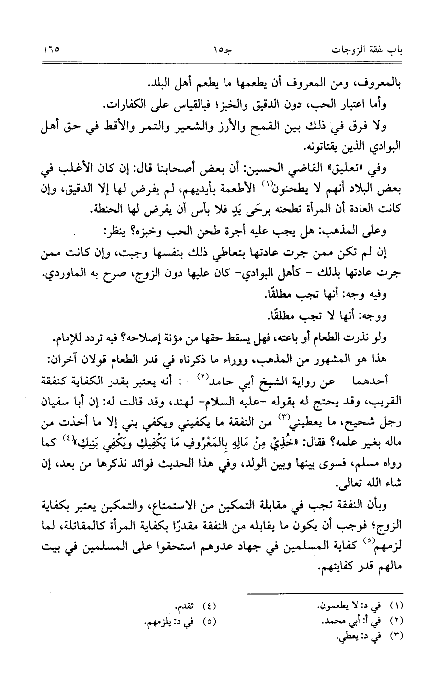 أحدهما- عن رواية الشيخ ابي حامد: أنه يعتبر بقدر الكفاية كنفقة القريب، وقد يحتج له بقوله- عليه السلام- لهند، وقد قالت له: إن أبا سفيان رجل شحيح، ما يعطيني من النفقة ما يكفين ويكفي بني إلا ما أخذت من ماله بغير علمه؟ فقال: "خذي من ماله بالمعروف ما يكفيك ويكفي بنيك" كما رواه مسلم، فسوى بينها وبين الولد، وفي هذا الحديث فوائد نذكرها من بعد، إن شاء الله تعالى.