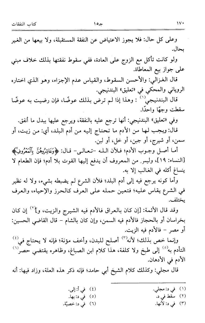 وقد قال الأئمة: [إن كان بالعراق فالأدم فيه الشيرج والزيت، و] إن كان بخراسان أو بالحجاز فالأدم فيه السمن، وإنكان بالشام – قال القاضي الحسين: أو مصر- فالأدم فيه الزيت.