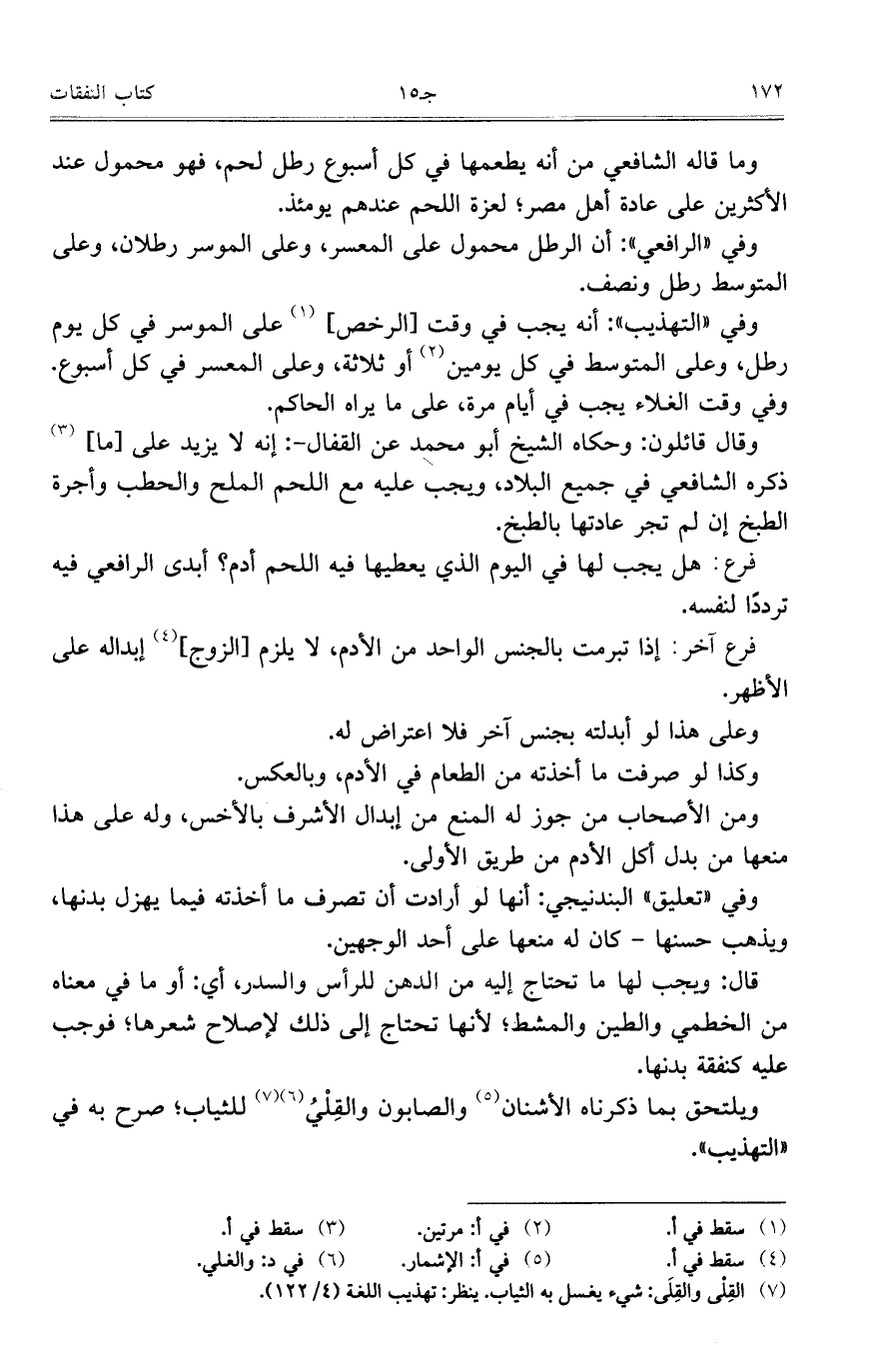وقال قائلون: وحكاه الشيخ أبو محمد عن القفال-: إنه لا يزيد على [ما] ذكره الشافعي في جميع البلاد، ويجب عليه مع اللحم الملح والحطب وأجرة الطبخ إن لم تجر عادتها بالطبخ.