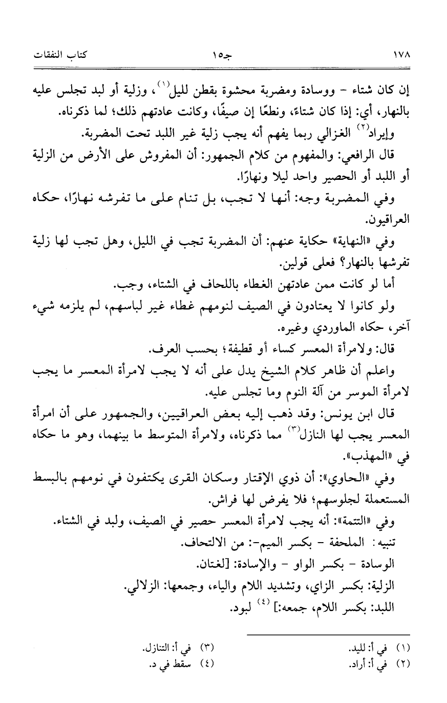 قال ابن يونس: وقد ذهب إليه بعض العراقيين، والجمهور على أن امرأة المعسر يجب لها النازل مما ذكرناه، ولامرأة المتوسط ما بينهما، وهو ما حكاه في "المهذب".