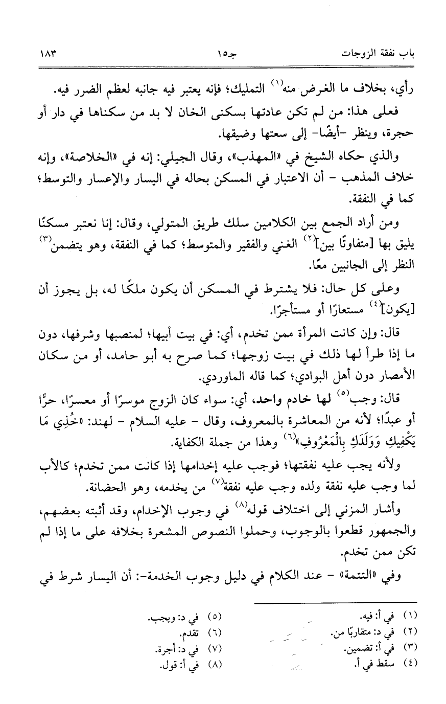 قال: وجب لها خادم واحد، أي: سواء كان الزوج موسراً أو معسراً، حراً أو عبداً؛ لأنه من المعاشرة بالمعروف، وقال- عليه السلام- لهند: "خُذِي مَا يَكْفِيكِ وَوَلَدَكِ بِالْمَعْرُوفِ" وهذا من جملة الكفاية.