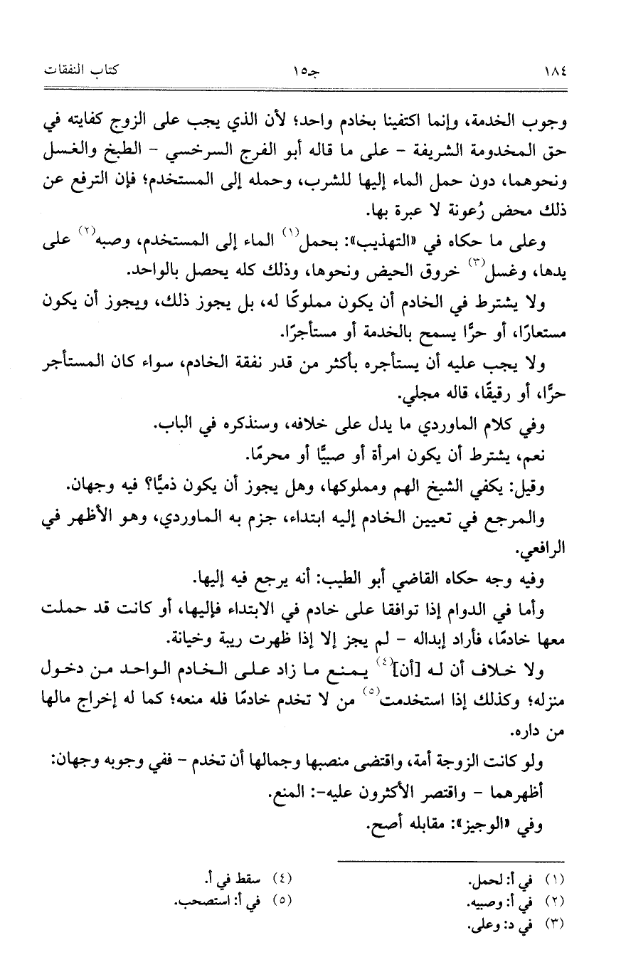 وجوب الخدمة، وإنما اكتفينا بخادم واحد؛ لأن الذي يجب على الزوج كفايته في حق المخدومة الشريفة- على ما قاله أبو الفرج السرخسي- الطبخ والغسل ونحوهما، دون حمل الماء إليها للشرب، وحمله إلى المستخدم؛ فإن الترفع عن ذلك محض رعونة لا عبرة بها.