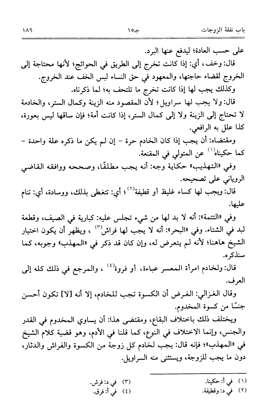 قال: ولخادم امرأة المعسر عباءة، أو فروة، والمرجع في ذلك كله إلى العرف.