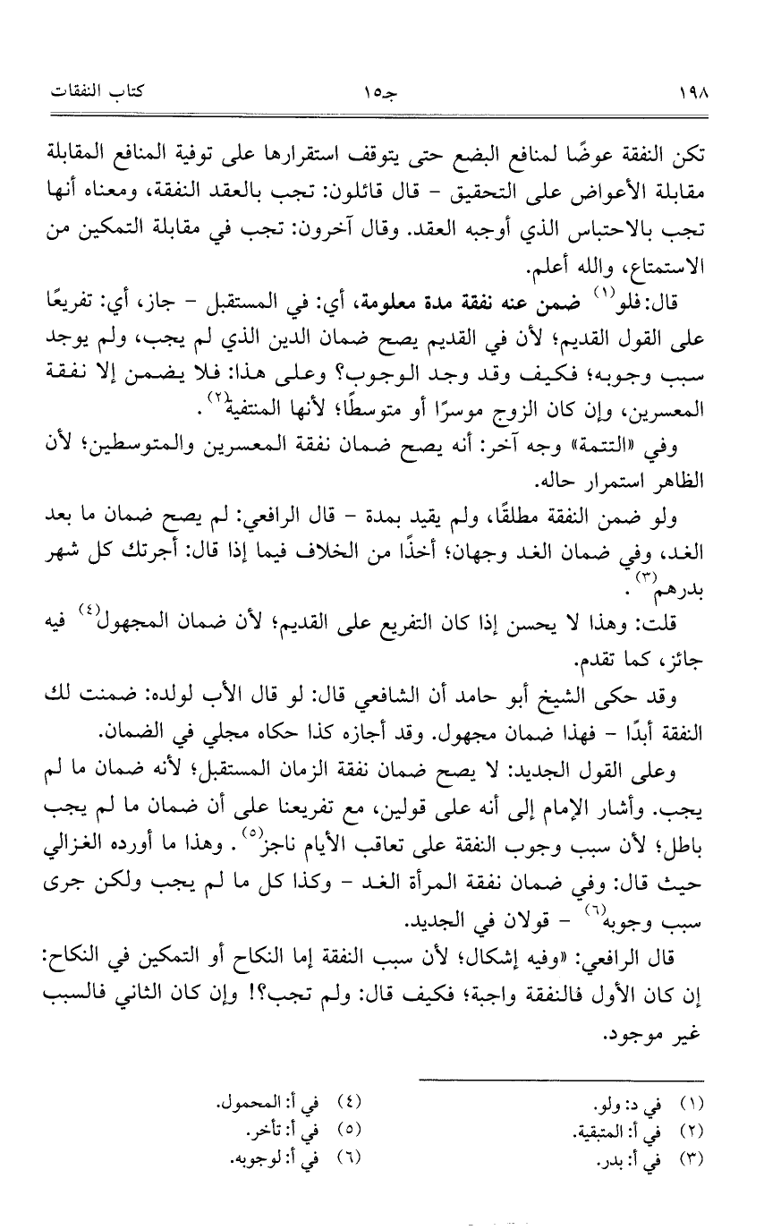 وعلى القول الجديد: لا يصح ضمان نفقة الزمان المستقبل؛ لأنه ضمان ما لم يجب. وأشار الإمام إلى أنه على قولين، مع تفريعنا على أن ضمان ما لم يجب باطل؛ لأن سبب وجوب النفقة على تعاقب الأيام ناجز. وهذا ما أورده الغزالي حيث قال: وفي ضمان نفقة المرأة الغد- وكذا كل ما لم يجب ولكن جرى سبب وجوبه- قولان في الجديد.