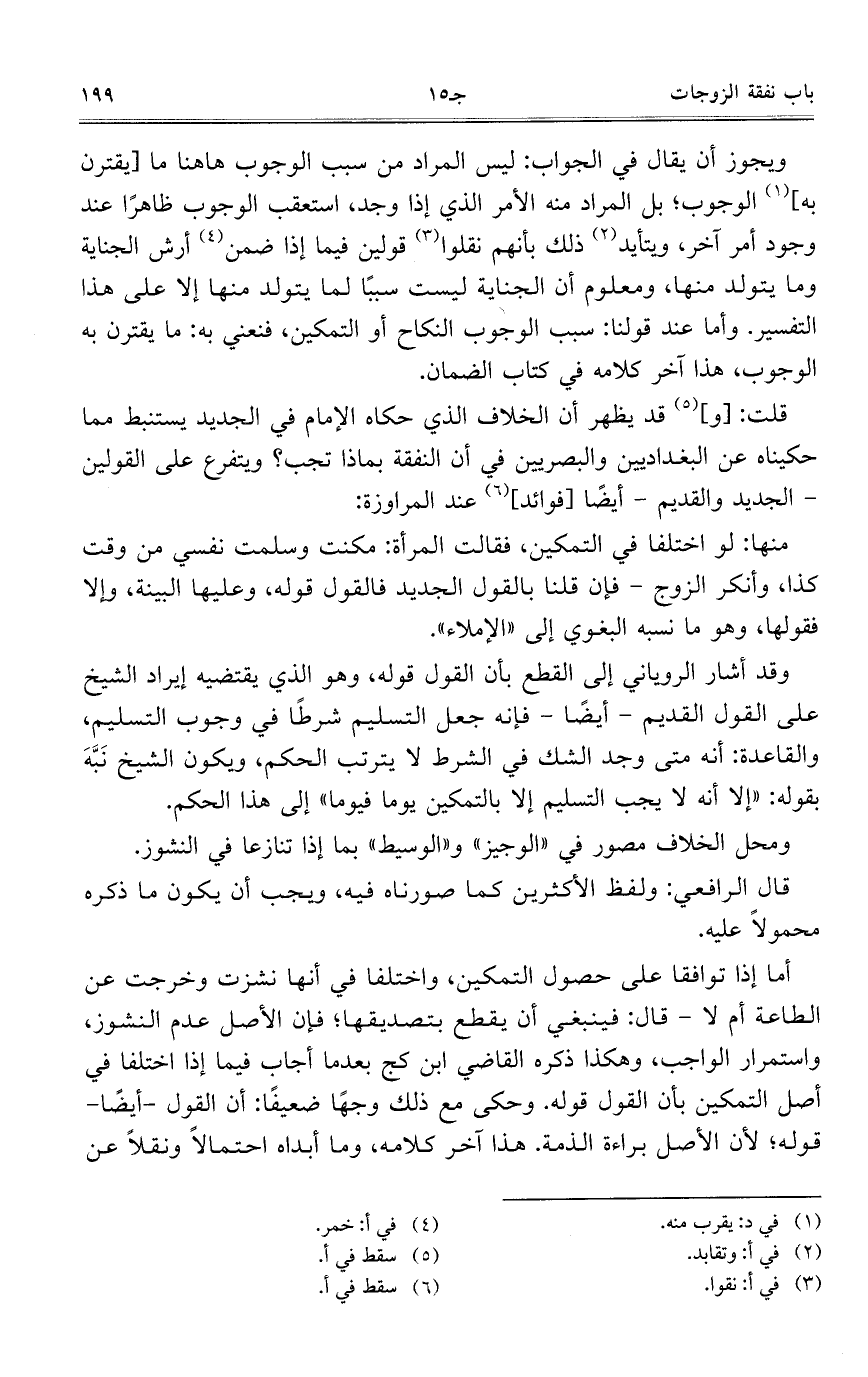 ويجوز أن يقال في الجواب: ليس المراد من سبب الوجوب هاهنا ما [يقترن به] الوجوب؛ بل المراد منه الأمر الذي إذا وجد، استعقب الوجوب ظاهراً عند وجود أمر آخر، ويتأيد ذلك بأنهم نقلوا قولين فيما إذا ضمن أرش الجناية وما يتولد منها، ومعلوم أن الجناية ليست سبباً لما يتولد منها إلا على هذا التفسير. وأما عند قولنا: سبب الوجوب النكاح أو التمكين، فنعني به: ما يقترن به الوجوب، هذا آخر كلامه في كتاب الضمان.