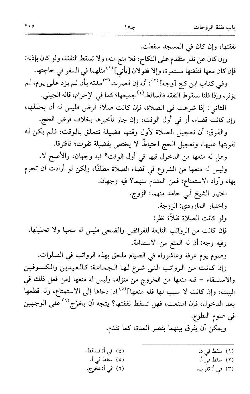 وإن كانت من الرواتب التي شرع لها الجماعة: كالعيدين والكسوفين والاستسقاء- فله منعها من الخروج من منزله، وليس له منعها [من فعل ذلك في البيت، وإن كانت لا سبب لها فله منعها] إذا دعاها إلى الاستمتاع، وله قطعها بعد الدخول، فإن امتنعت، فهل تسقط نفقتها؟ يتجه أن يخرج على الوجهين في صوم التطوع.