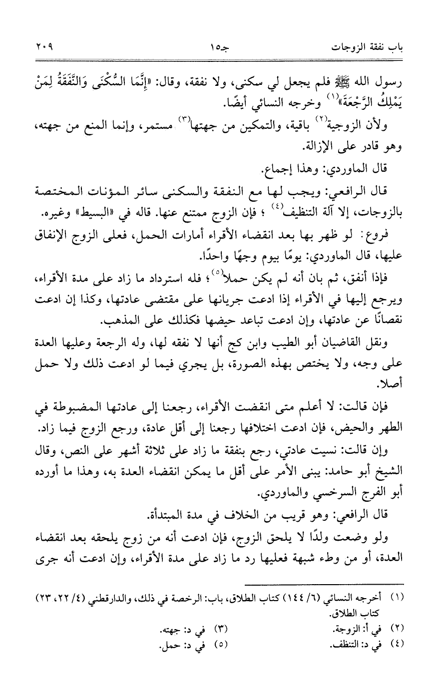ونقل القاضيان أبو الطيب وابن كج أنها لا نفقة لها، وله الرجعة وعليها العدة على وجه، ولا يختص بهذه الصورة، بل يجري فيما لو ادعت ذلك ولا حمل أصلاً.