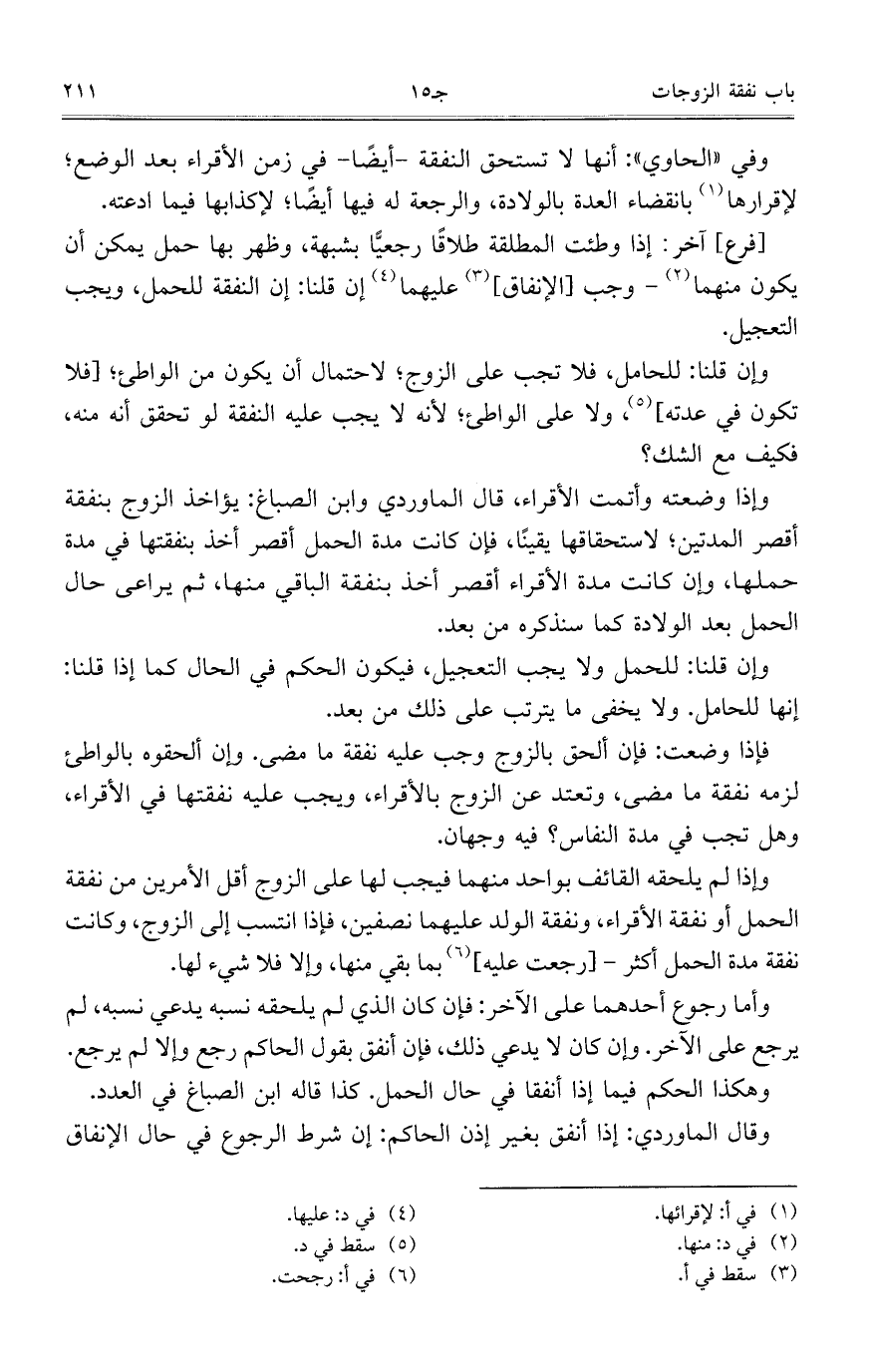 وإذا وضعته وأتمت الأقراء، قال الماوردي وابن الصباغ: يؤاخذ الزوج بنفقة أقصر المدتين؛ لاستحقاقها يقيناً، فإن كانت مدة الحمل أقصر أخذ بنفقتها في مدة حملها، وإن كانت مدة الأقراء أقصر أخذ بنفقة الباقي منها، ثم يراعى حال الحمل بعد الولادة كما سنذكره من بعد.