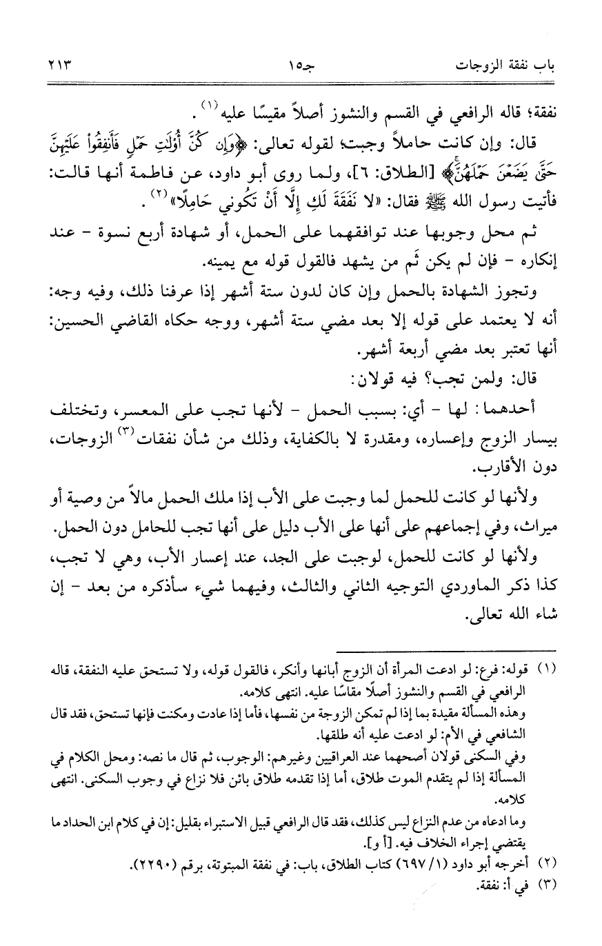 قال: وإن كانت حاملاً وجبت؛ لقوله تعالى: {وَإِنْ كُنَّ أُولاتِ حَمْلٍ فَأَنْفِقُوا عَلَيْهِنَّ حَتَّى يَضَعْنَ حَمْلَهُنَّ} [الطلاق: 6]، ولما روى أبو داود، عن فاطمة أنها قالت: فأتيت رسول الله صلى الله عليه وسلم فقال: "لا نَفَقَةَ لَكِ إِلَّا أَنْ تَكُوني حَامِلاً".