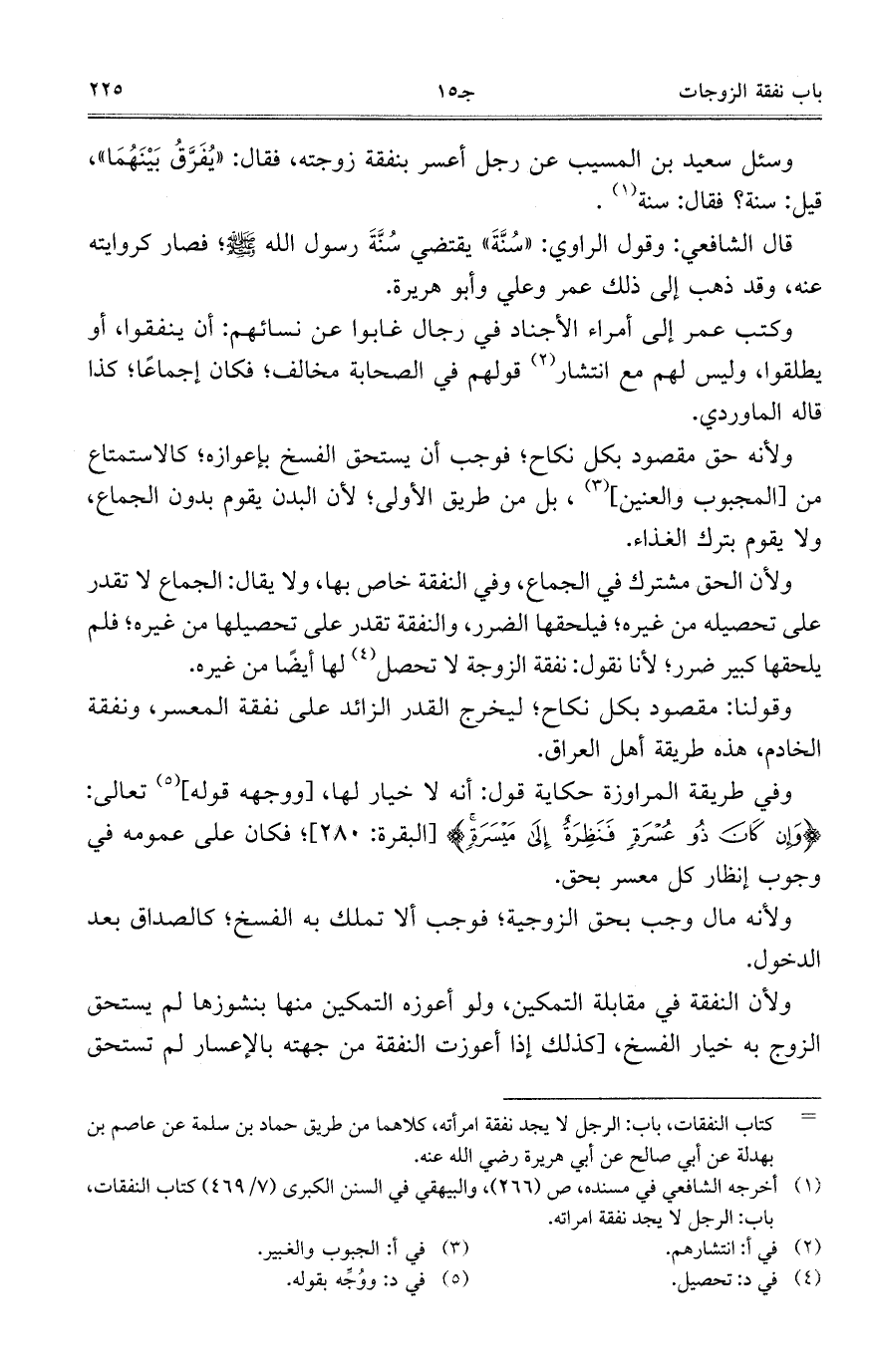 وسئل سعيد بن المسيب عن رجل أعسر بنفقة زوجته، فقال: "يُفَرَّقُ بَيْنَهُمَا" قيل: سنة؟ فقال: سنة.