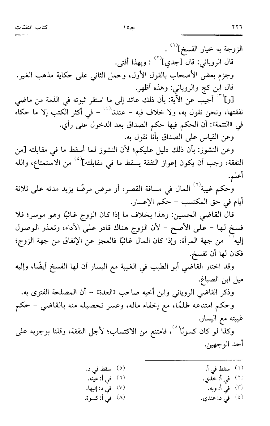 وعن النشوز: بأن ذلك دليل عليكم؛ لأن النشوذ لما أسقط ما في مقابلته [من النفقة، وجب أن يكون إعواز النفقة يسقط ما في مقابلته] من الاستمتاع، والله أعلم.