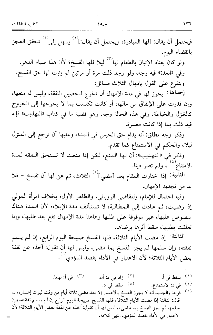 الثالثة: إذامضت الأيام الثلاثة، فلها الفسخ صبيحة اليوم الرابع، إن لم يسلم نفقته، وإن سلمها لم يجز الفسخ بما مضى، وليس لها أن تقول: آخذه عن نفقة بعض الأيام الثلاثة؛ لأن الاعتبار في الأداء بقصد المؤدي.
