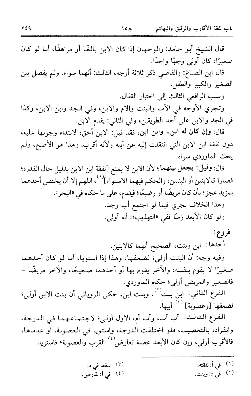 الفرع الثاني: ابن بنت، وبنت ابن، حكى الروياني أن بنت الابن أولى؛ لضعفها [وعصوبة] أبيها.