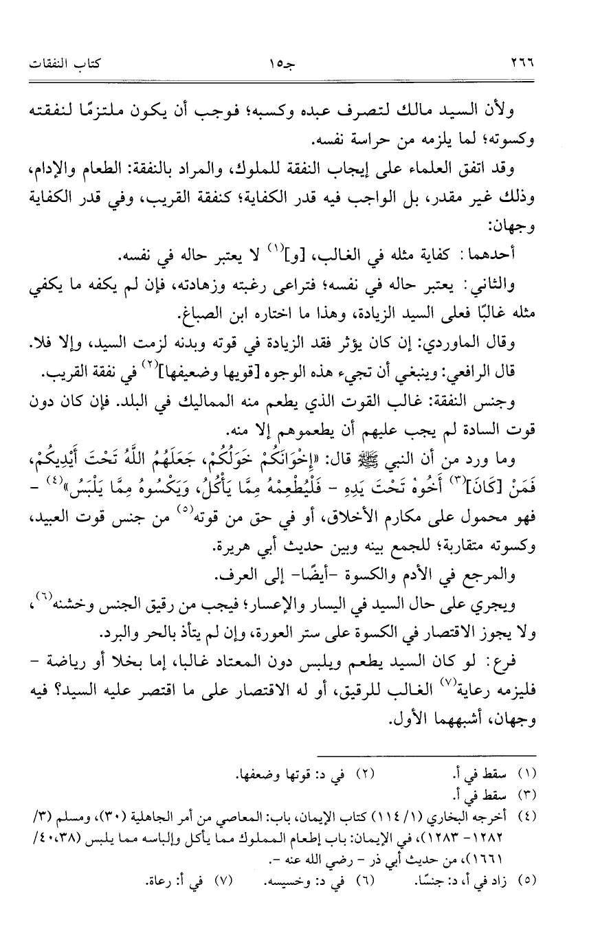 وما ورد من أن النبي صلى الله عليه وسلم قال: "إخوانكم خولكم, جعلهم الله تحت أيديكم, فمن [كان] أخوه تحت يده – فليطعمه مما يأكل, ويكسوه مما يلبس" – فهو محمول على مكارم الأخلاق, أو في حق من قوته من جنس قوت العبيد, وكسوته متقاربة؛ للجمع بينه وبين حديث أبي هريرة.