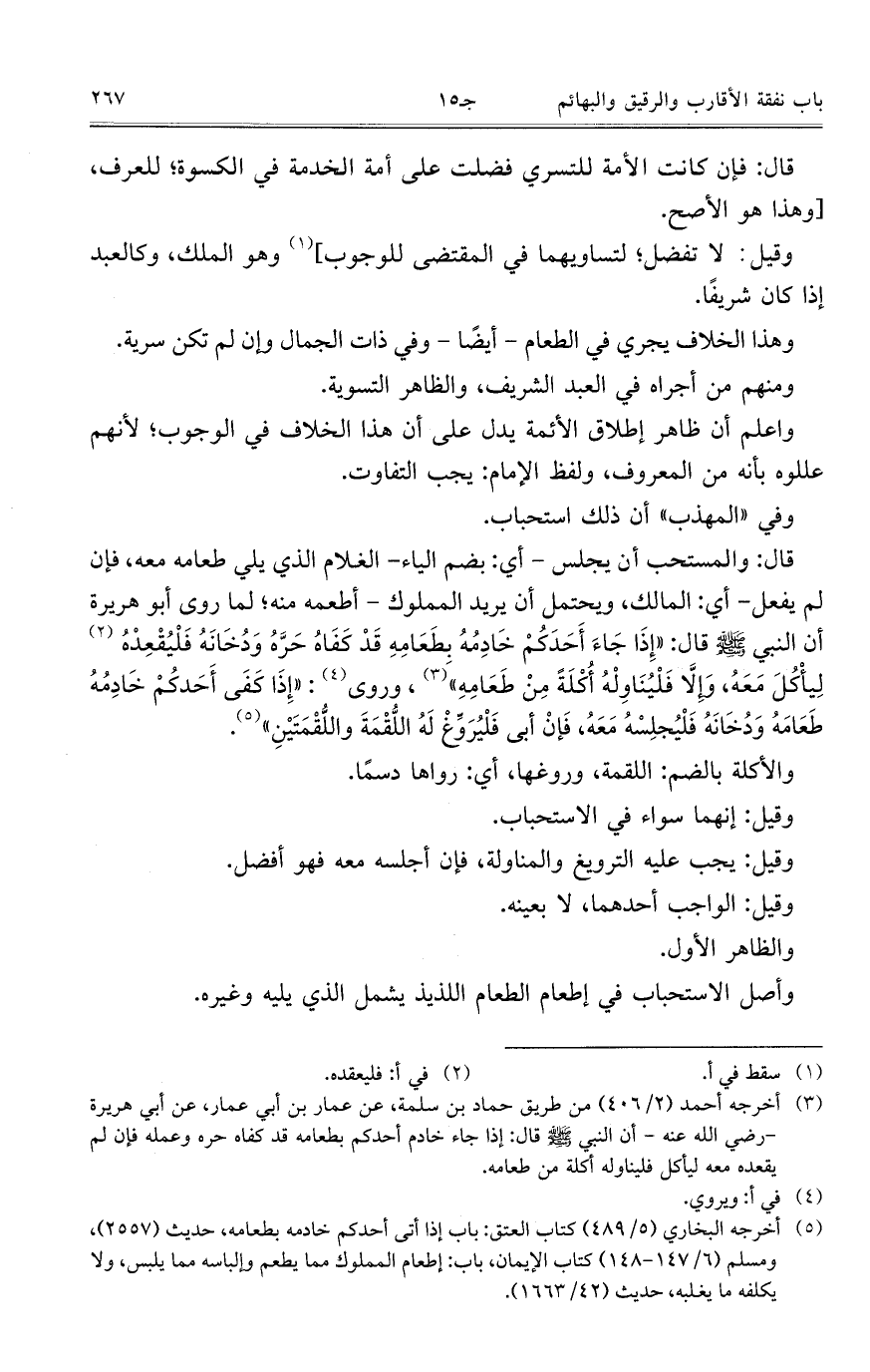 قال: والمستحب أن يجلس – أي: بضم الياء – الغلام الذي يلي طعامه معه, فإن لم يفعل – أي: المالك, ويحتمل أن يريد المملوك – أطعمه منه؛ لما روى أبو هريرة أن النبي صلى الله عليه وسلم قال: "إذا جاء أحدكم خادمه بطعامه قد كفاه حره ودخانه فليقعده ليأكل معه, وإلا فليناوله أكله من طعامه", وروى: "إذا كفى أحدكم خادمه طعامه ودخانه فليجلسه معه, فإن أبى فليروغ له اللقمة واللقمتين".