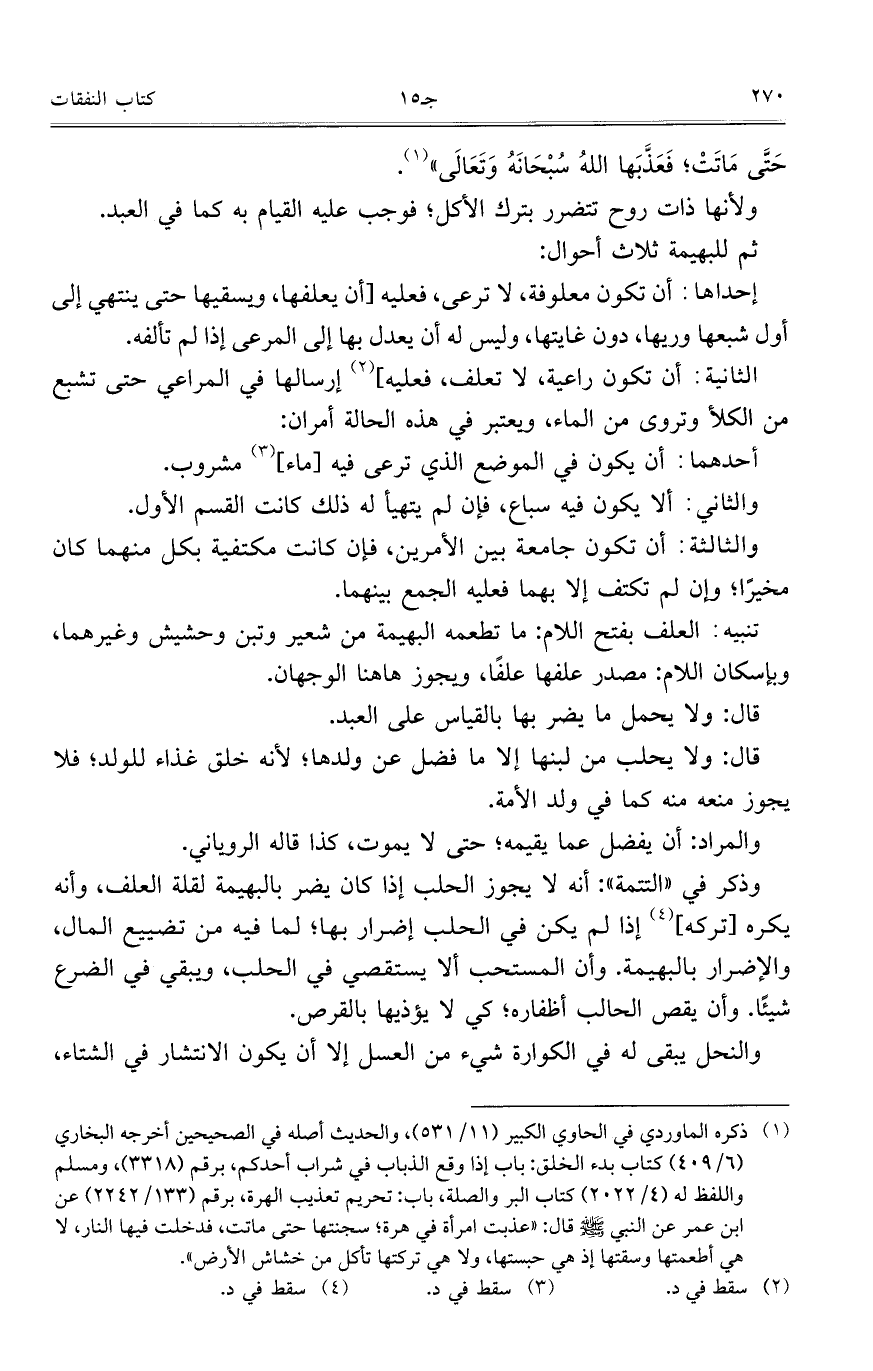 إحداها: أن تكون معلوفة، لا ترعى، فعليه [ان يعلفها، ويسقيها حتى ينتهي إلى أول شبعها وريها، دون غايتها، وليس له أن يعدل بها إلى المرعي إذا لم تألفه.