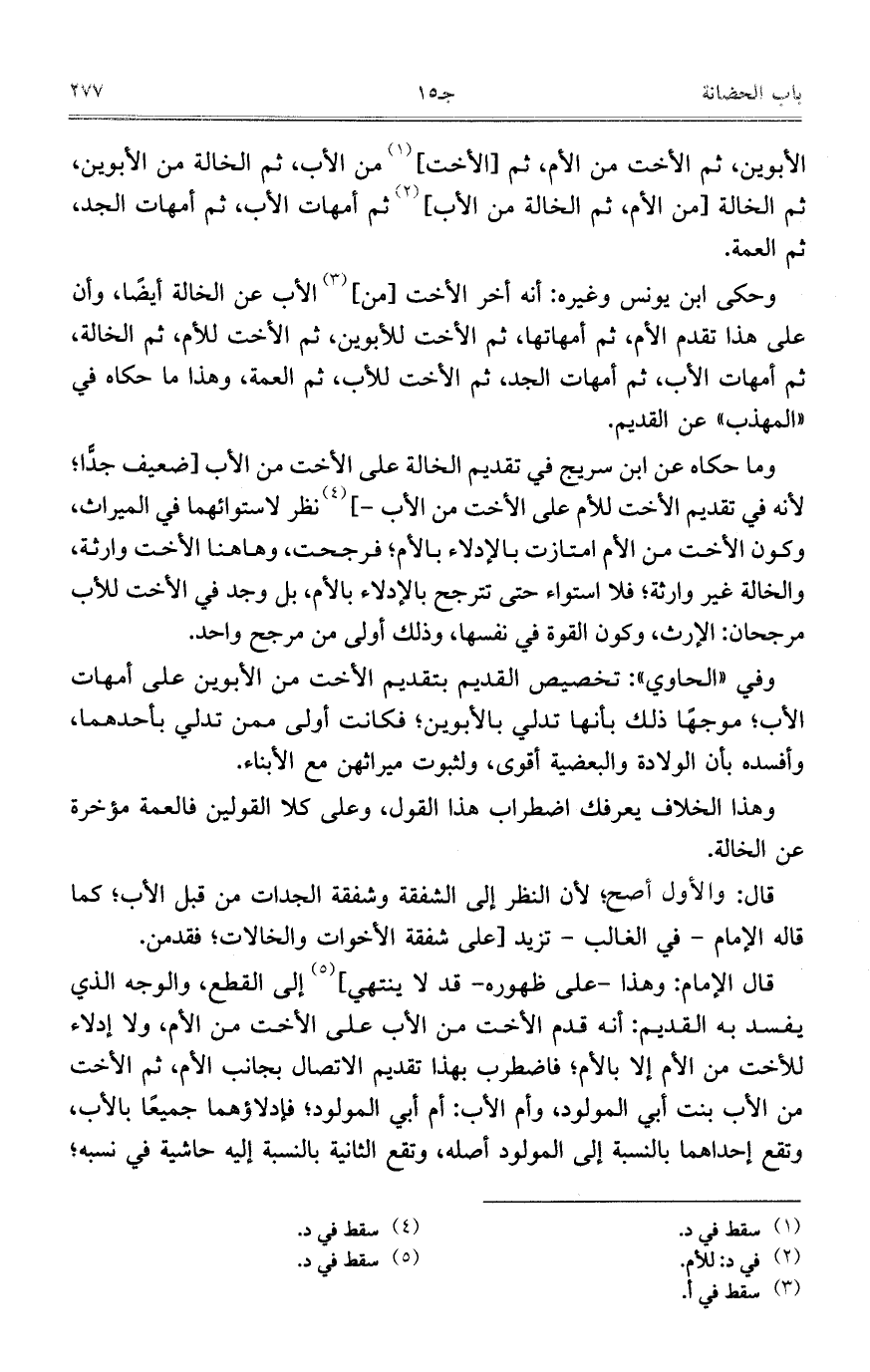 وما حكاه عن ابن سريج في تقديم الخالة على الأخت من الأب [ضعيف جدًّا؛ لأنه في تقديم الأخت للأم على الأخت من الأب-] نظر لاستوائهما في الميراث، وكون الأخت من الأم امتازت بالإدلاء بالأم؛ فرجحت، وهاهنا الأخت وارثة، والخالة غير وارثة؛ فلا استواء حتى تترجح بالإدلاء بالأم، بل وجد في الأخت للأب مرجحان: الإرث، وكون القوة في نفسها، وذلك أولى من مرجح واحد.