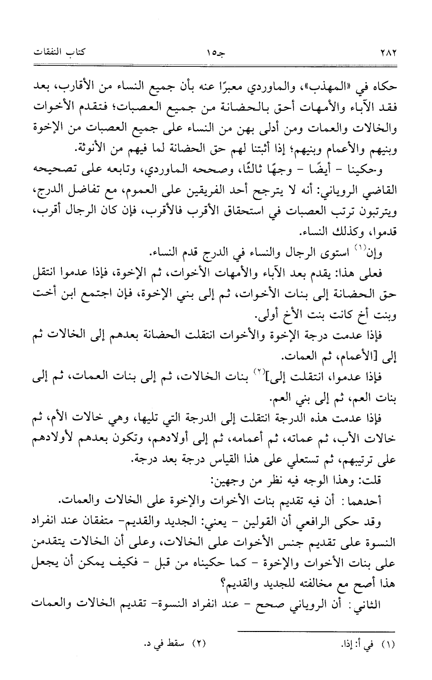 وقد حكى الرافعي أن القولين – يعني: الجديد والقديم – متفقان عند انفراد النسوة على تقديم جنس الأخوات على الخالات، وعلى أن الخالات يتقدمن على بنات الأخوات والإخوة- كما حكيناه من قبل – فكيف يمكن أن يجعل هذا أصح مع مخالفته للجديد والقديم؟