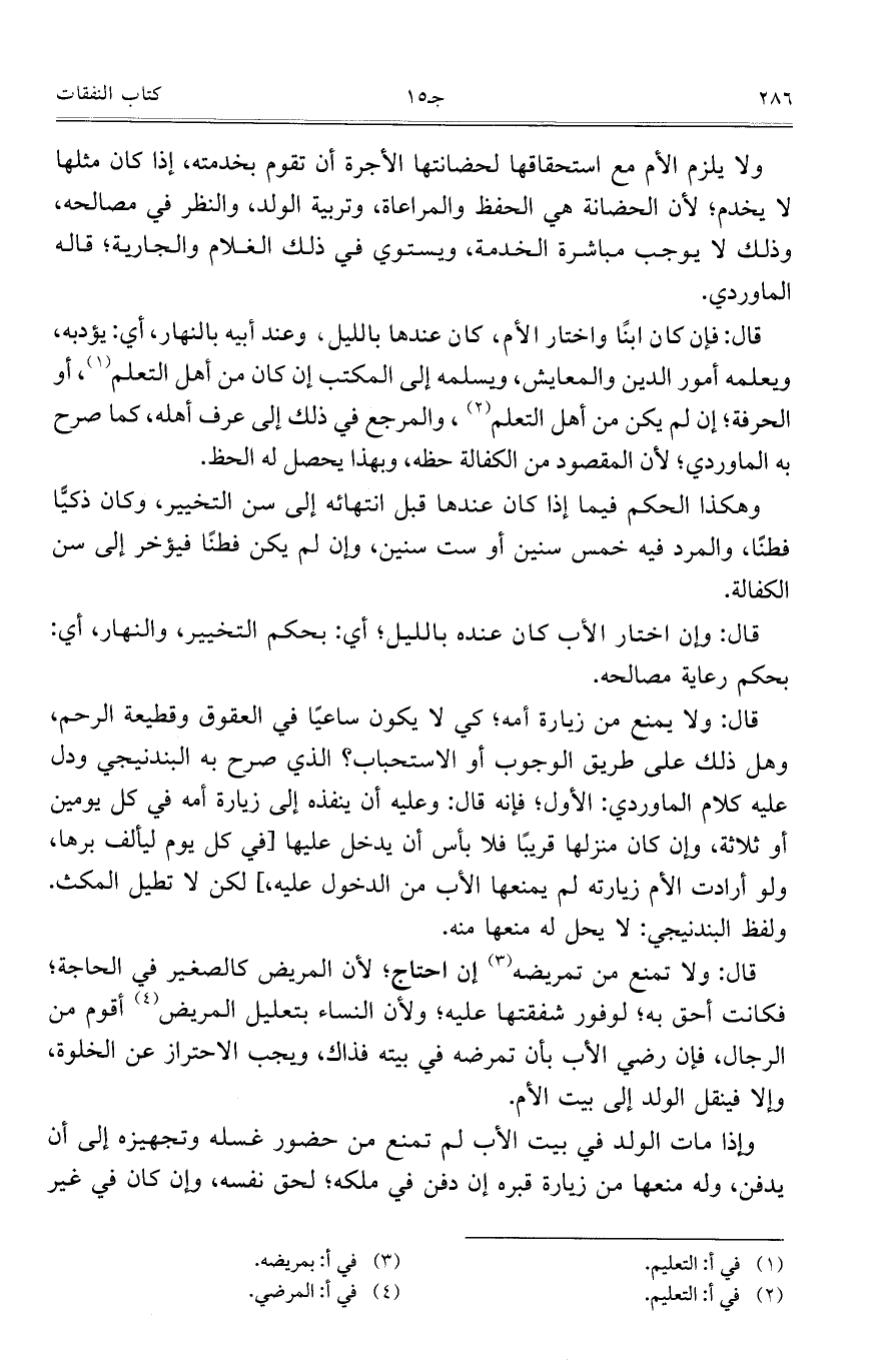 قال: ولا تمنع من تمريضه إن احتاج؛ لأن المريض كالصغير في الحاجة؛ فكانت أحق به؛ لوفور شفقتها عليه؛ ولأن النساء بتعليل المريض أقوم من الرجال، فإن رضي الأب بأن تمرضه في بيته فذاك، ويجب الاحتراز عن الخلوة، وإلا فينقل الولد إلى بيت الأم.