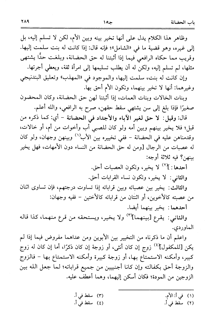 قال: وقيل: لا حق لغير الآباء والأجداد في الحضانة- أي: كما ذكره من قبل؛ فلا يخير بينهم وبين أمه ولو كان للصبي أب وأخوات من أم، أو الخالات، وقدمناهن عليه في الحضانة – ففي تخييره بين الأب وبينهن وجهان، ولو كان له عصبات من الرجال [ومن له حق الحضانة من النساء دون الأمهات، فهل يخير بينهن؟ فيه ثلاثة أوجه: