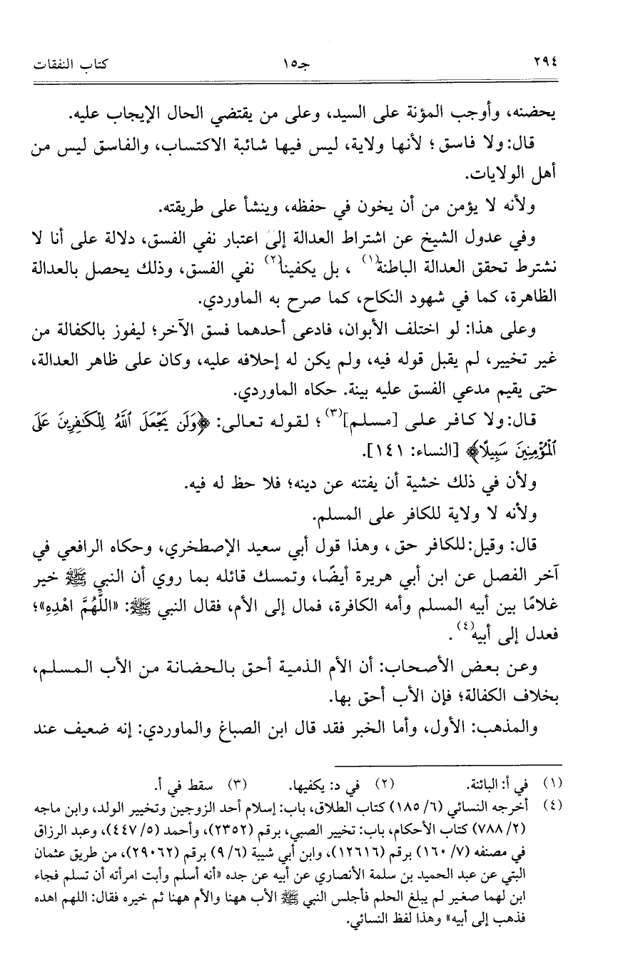 وعن بعض الأصحاب: أن الأم الذمية احق بالحضانة من الأب المسلم، بخلاف الكفالة؛ فإن الأب أحق بها.