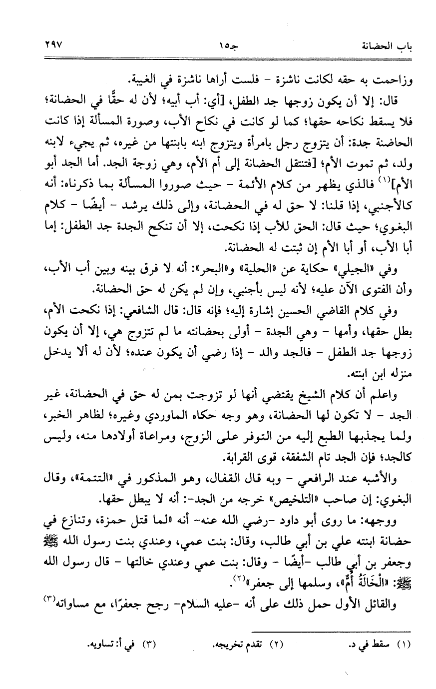 واعلم أن كلام الشيخ يقتضي أنها لو تزوجت بمن له حق في الحضانة، غير الجد – لا تكون لها الحضانة، وهو وجه حكاه الماوردي وغيره؛ لظاهر الخبر، ولما يجذبها الطبع إليه من التوفر على الزوج، ومراعاة أولادها منه، وليس كالجد؛ فإن الجد تام الشفقة، قوى القرابة.