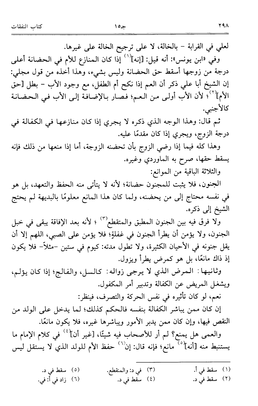 ثم قال: وهذا الوجه الذي ذكره لا يجري إذا كان منازعها في الكفالة في درجة الزوج، ويجري إذا كان مقدماً عليه.