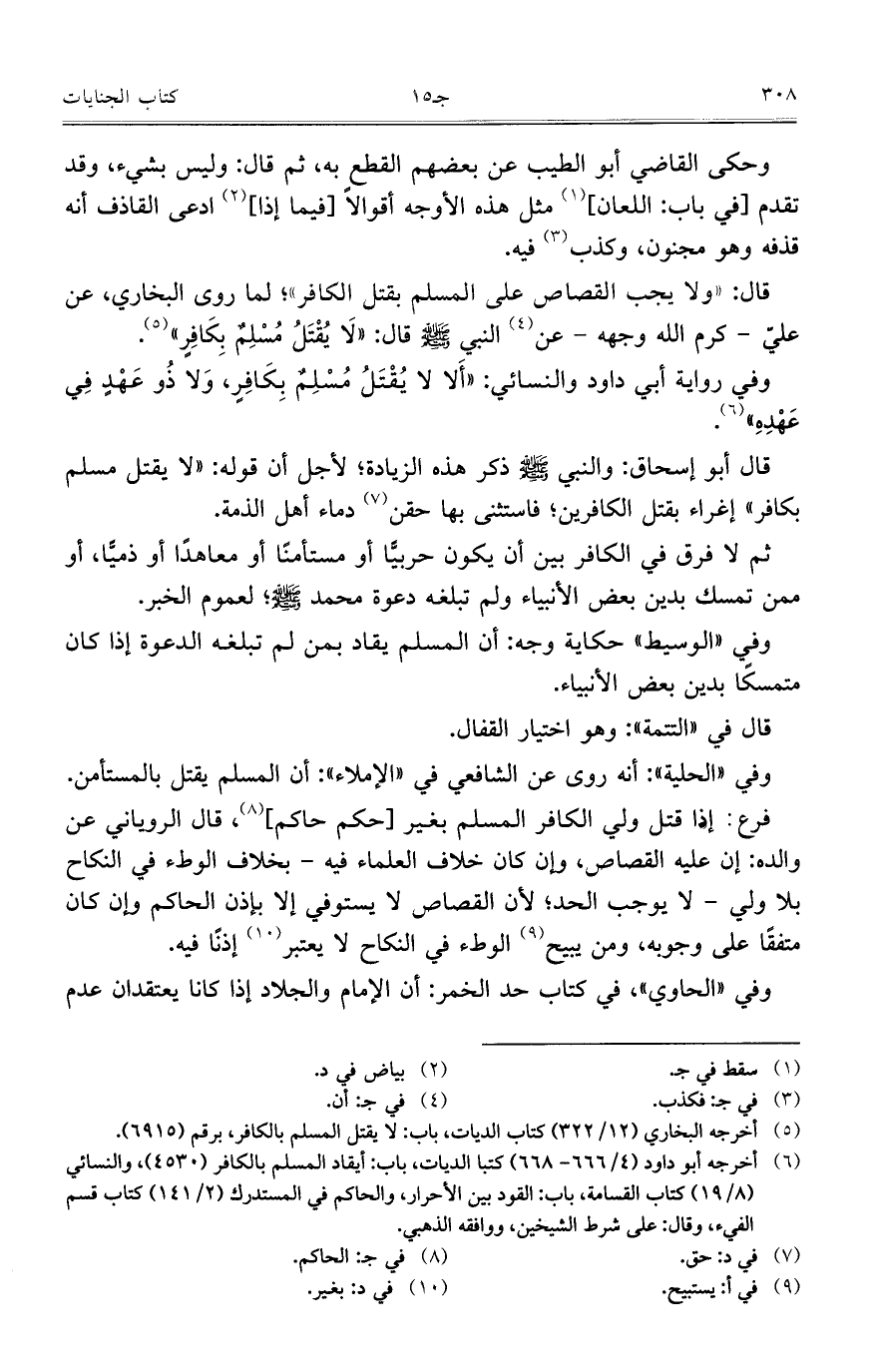 وفي رواية أبي داود والنسائي: "أَلا لا يُقْتَلُ مُسْلِمٌ بِكَافِرٍ، وَلا ذُو عَهْدٍ فِي عَهْدِهِ".