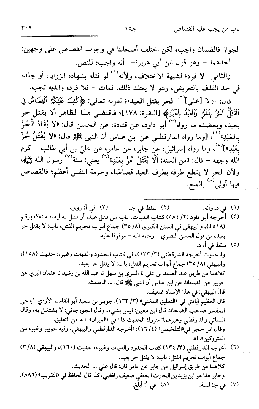 قال: "ولا [على] الحر بقتل العبد"؛ لقوله تعالى: {كُتِبَ عَلَيْكُمْ الْقِصَاصُ فِي الْقَتْلَى الْحُرُّ بِالْحُرِّ وَالْعَبْدُ بِالْعَبْدِ} [البقرة: 178]؛ فاقتضى هذا الظاهر ألا يقتل حر بعبد، ويعضده ما رواه أبو داود، عن قتادة، عن الحسن قال: "لا يُقَادُ الْحُرُّ بِالعَبْدِ"، [وما رواه الدارقطني عن ابن عباس أن النبي صلى الله عليه وسلم قال: "لا يُقْتَلُ حُرٌّ بِعَبْدٍ]، يعني: سنة رسول الله صلى الله عليه وسلم، ولأن الحر لا يقطع طرفه بطرف العبد قصاصاً، وحرمة النفس أعظم؛ فالقصاص فيها أولى بالمنع.