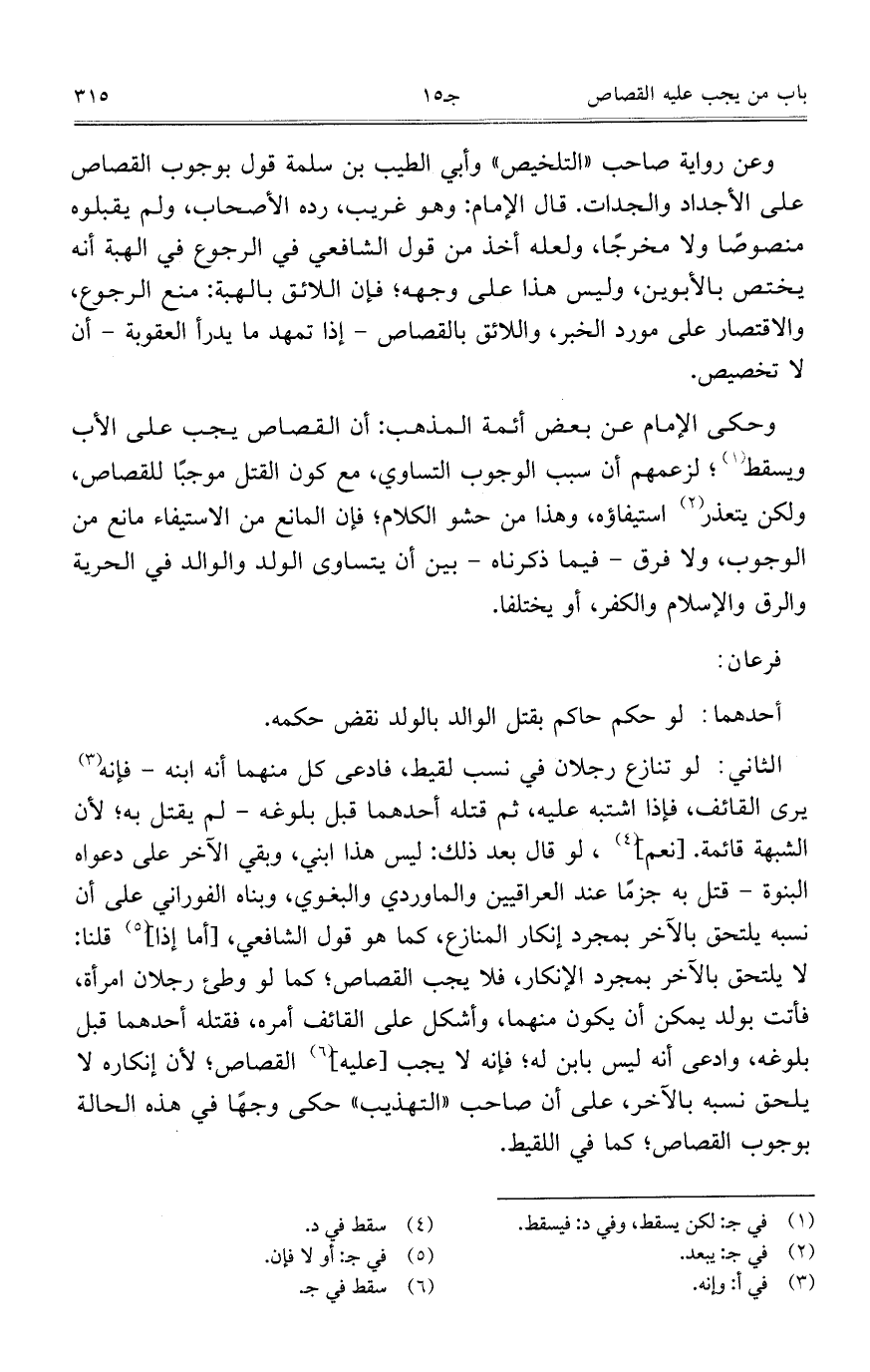 وحكى الإمام عن بعض أئمة المذهب: أن القصاص يجب على الأب ويسقط؛ لزعمهم أن سبب الوجوب التساوي، مع كون القتل موجباً للقصاص، ولكن يتعذر استيفاؤه، وهذا من حشو الكلام؛ فإن المانع من الاستيفاء مانع من الوجوب، ولا فرق – فيما ذكرناه – بين أن يتساوى الولد والوالد في الحرية والرق والإسلام والكفر، أو يختلفا.
