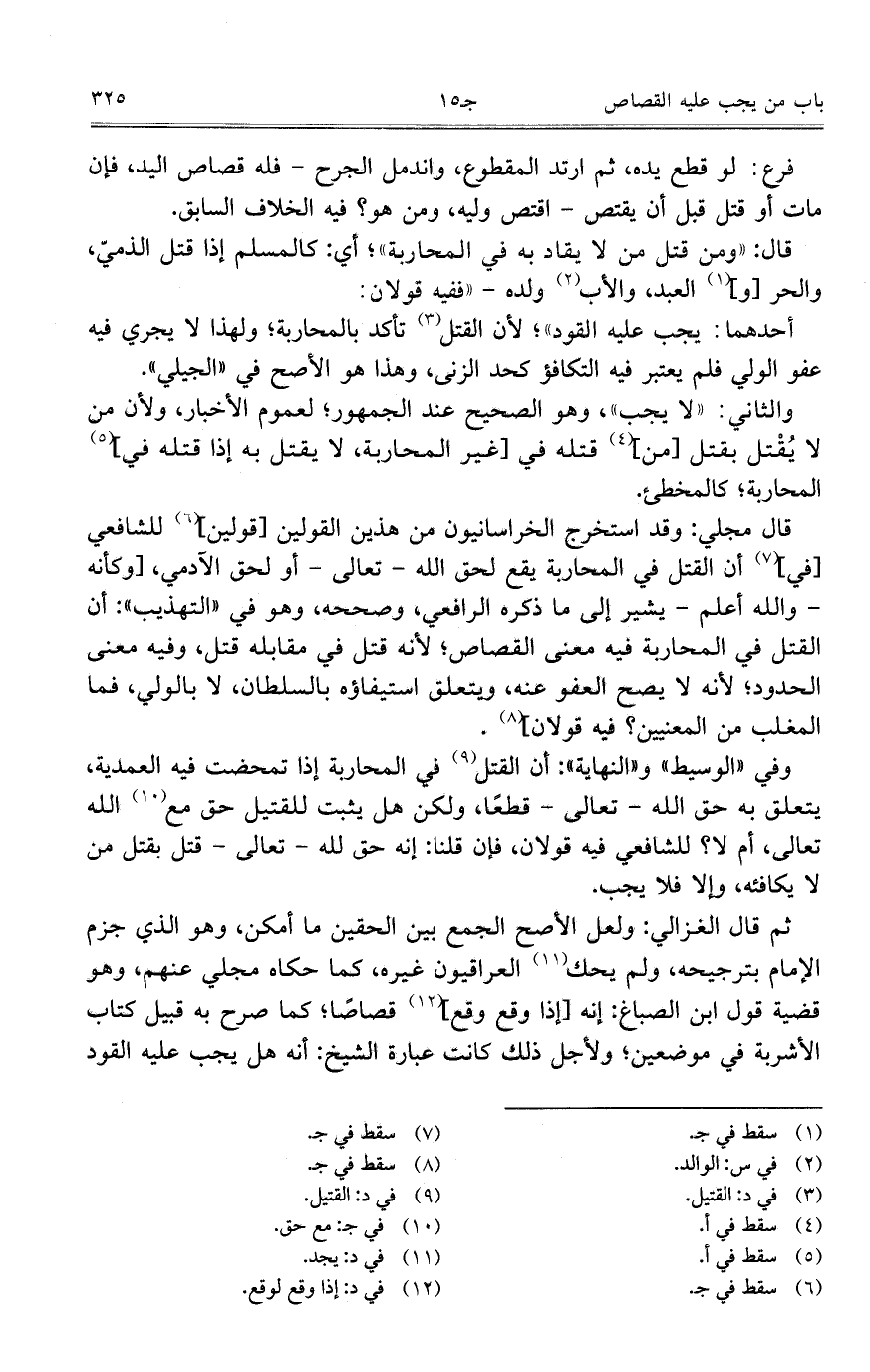 ثم قال الغزالي: ولعل الأصح الجمع بين الحقين ما أمكن، وهوا لذي جزم الإمام بترجيحه، ولم يحك العراقيون غيره، كما حكاه مجملي عنهم، وهو قضية قول ابن الصباغ: إنه [إذا وقع وقع] قصاصاً؛ كما صرح به قبيل كتاب الأشربة في موضعين؛ ولأجل ذلك كانت عبارة الشيخ: أنه هل يجب عليه القود