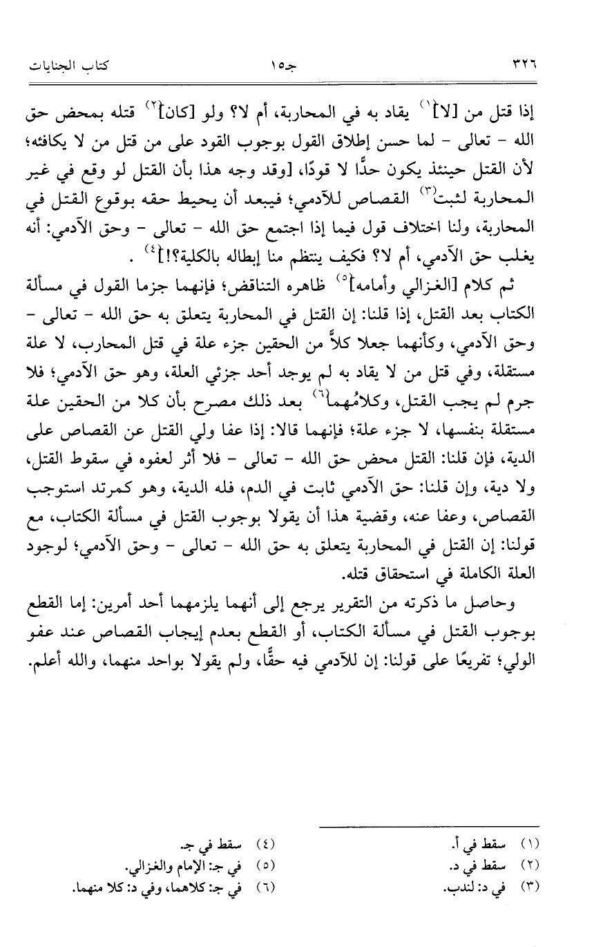 ثم كلام [الغزالي وأمامه] ظاهره التناقض؛ فإنهما جزما القول في مسألة الكتاب بعد القتل، إذا قلنا: إن القتل في المحاربة يتعلق به حق الله – تعالى – وحق الآدمي، وكأنهما جعلا كلاًّ من الحقين جزء علة في قتل المحارب، لا على مستقلة، وفي قتل من لا يقاد به لم يوجد أحد جزئي العلة، وهو حق الآدمي؛ فلا جرم لم يجب القتل، وكلامُهما بعد ذلك مصرح بأن كلا من الحقين علة مستقلة بنفسها، لا جزء علة؛ فإنهما قالا: إذا عفا ولي القتل عن القصاص على الدية، فإن قلنا: القتل محض حق الله – تعالى – فلا أثر لعفوه في سقوط القتل، ولا دية، وإن قلنا: حق الآدمي ثابت في الدم، فله الدية، وهو كمرتد استوجب القصاص، وعفا عنه، وقضية هذا أن يقولا بوجوب القتل في مسألة الكتاب، مع قولنا: إن القتل في المحاربة يتعلق به حق الله- تعالى- وحق الآدمي؛ لوجود العلة الكاملة في استحقاق قتله.