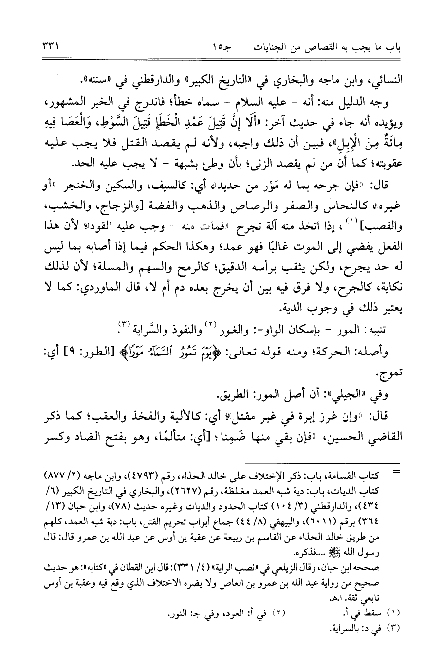 قال:"فإن جرحه بما له مَوْر من حديد"، أي: كالسيف، والسكين والخنجر "أو غيره"، كالنحاس والصفر والرصاص والذهب والفضة [والزجاج، والخشب، والقصب]، إذا اتخذ منه آلة تجرح "فمات منه – وجب عليه القود"؛ لن هذا الفعل يفضي إلى الموت غالباً فهو عمد؛ وهكذا الحكم فيما إذا أصابه بما ليس له حد يجرح، ولكن يثقب برأسه الدقيق؛ كالرمح والسهم والمسلة؛ لأن لذلك نكاية، كالجرح، ولا فرق فيه بين أن يخرج بعده دم أم لا، قال الماوردي: كما لا يعتبر ذلك في وجوب الدية.