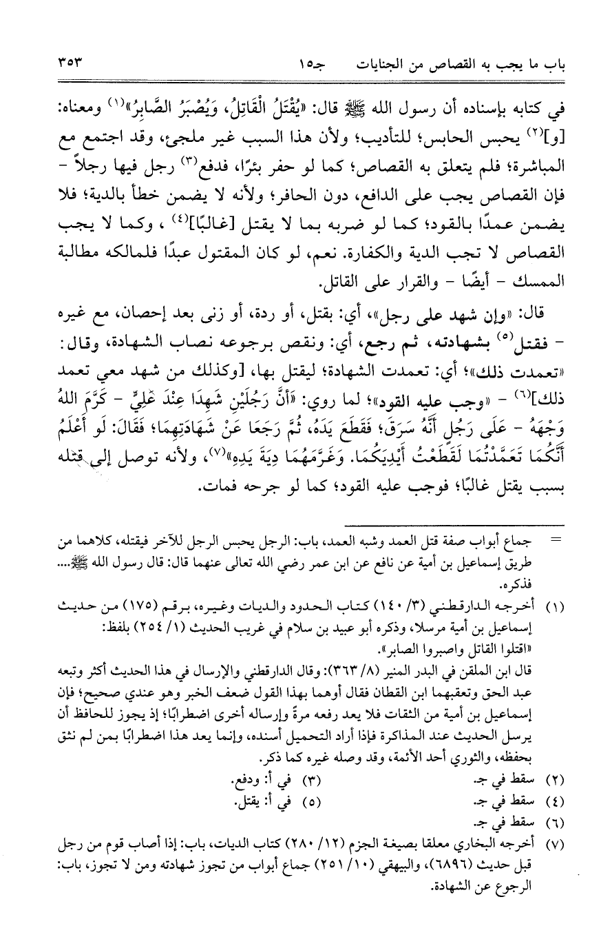 في كتابه بإسناده أن رسول الله صلى الله عليه وسلم قال: "يُقْتَلُ الْقَاتِلُ، وَيُصْبَرُ الصَّابِرُ" ومعناه: [و] يحبس الحابس؛ للتأديب؛ ولأن هذا السبب غير ملجئ، وقد اجتمع مع المباشرة؛ فلم يتعلق به القصاص؛ كما لو حفر بئراً، فدفع رجل فيها رجلاً – فإن القصاص يجب على الدافع، دون الحافر؛ ولأنه لا يضمن خطأ بالدية؛ فلا يضمن عمداً بالقود؛ كما لو ضربه بما لا يقتل [غالباً]، وكما لا يجب القصاص لا تجب الدية والكفارة. نعمن لو كان المقتول عبداً فلمالكه مطالبة الممسك – أيضاً – والقرار على القاتل.