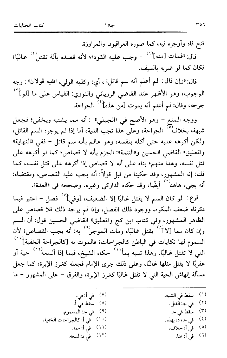 فرع: لو كان السم لا يقتل غالباً إلا الضعيف، [وفي] فصل – اعتبر فيما ذكرناه ضعف المكره، ووجود ذلك الفصل، وإذا لم يوجد ذلك فلا قصاص على الظاهر المشهور، وفي كتاب ابن كج و"تعليق" القاضي الحسين قول: أن السم وإن كان مما [لا] يقتل غالباً، ومات الموجر به: أنه يجب القصاص؛ لأن السموم لها نكايات في الباطن كالجراحات؛ فالموت به [كالجراحة الخفية] التي لا تقتل غالباً. وهذا شبيه بما حكاه الشيخ، فيما إذا ألسعه حية أو عقرباً لا يقتل مثلها غالباً، وعلى ذلك جرى الإمام فجعله كغرز الإبرة، كما جعل مسألة إنهاش الحية التي لا تقتل غالباً كغرز الإبرة، والفرق – على المشهور- ما