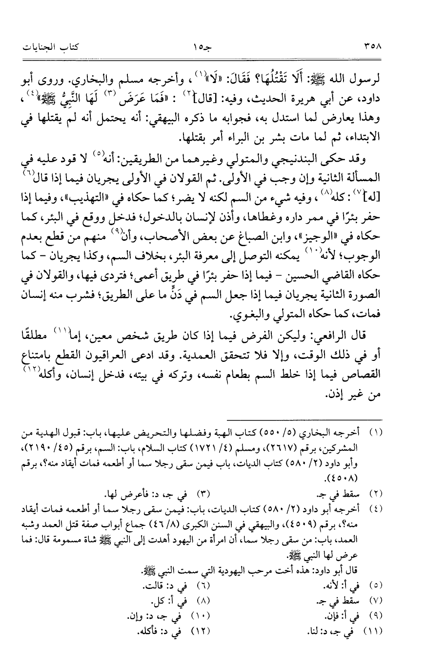 وقد حكى البندنيجي والمتولي وغيرهما من الطريقين: انه لا قود عليه في المسألة الثانية وإن وجب في الأولى. ثم القولان في الأولى يجريان فيما إذا قال [له]: كله، وفيه شيء من السم لكنه لا يضر؛ كما حكاه في "التهذيب"، وفيما إذا حفر بئراً في ممر داره وغطاها، وأذن لإنسان بالدخول؛ فدخل ووقع في البئر، كما حكاه في "الوجيز"، وابن الصباغ عن بعض الأصحاب، وأن منهم من قطع بعدم الوجوب؛ لأنه يمكنه التوصل إلى معرفة البئر، بخلاف السم، وكذا يجريان – كما حكاه القاضي الحسين – فيما إذا حفر بئراً في طريق أعمى؛ فتردى فيها، والقولان في الصورة الثانية يجريان فيما إذا جعل السم في دَنٍّ ما على الطريق؛ فشرب منه إنسان فمات، كما حكاه المتولي والبغوي.