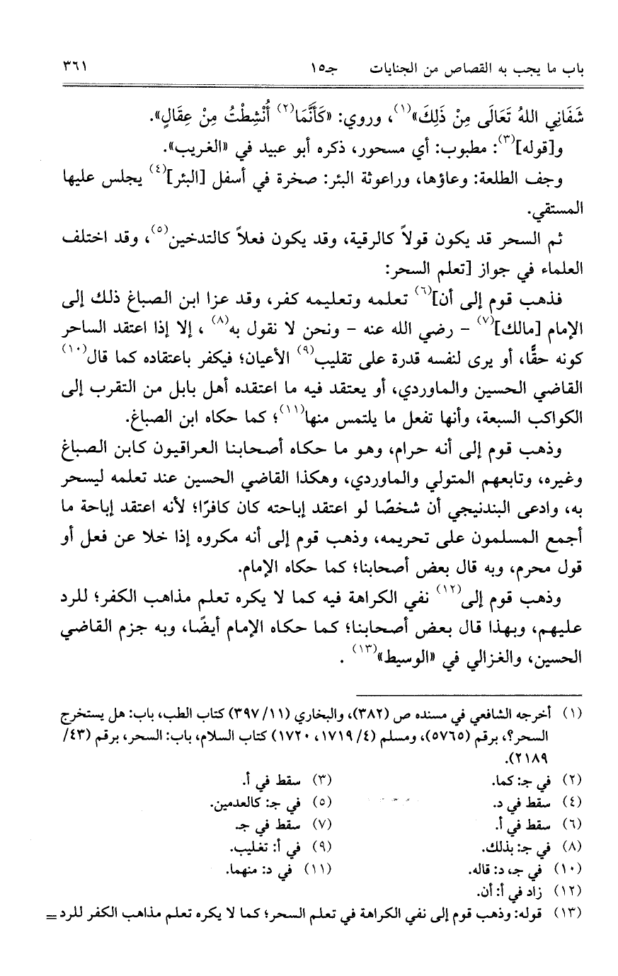 فذهب قوم إلى أن] تعلمه وتعليمه كفر، وقد عزا ابن الصباغ ذلك إلى الإمام [مالك] – رضي الله عنه – ونحن لا نقول به؛ إلا إذا اعتقد الساحر كونه حقًّا، أو يرى لنفسه قدرة على تقليب الأعيان؛ فيكفر باعتقاده كما قال القاضي الحسين والماوردي، أو يعتقد فيه ما اعتقده أهل بابل من التقرب إلى الكواكب السبعة، وأنها تفعل ما يلتمس منها؛ كما حكاه ابن الصباغ.