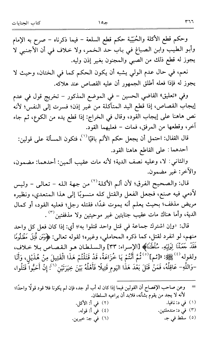 وفي "تعليق" القاضي الحسين – في الموضع المذكور – تخريج قول في عدم إيجاب القصاص، إذا قطع اليد المتآكلة من غير إذن؛ فسرت إلى النفس؛ لأنه نص هاهنا على إيجاب القود، وقال في الخراج: إذا قطع يده من الكوع، ثم جاء آخر، وقطعها من المرفق، فمات – فعليهما القودز