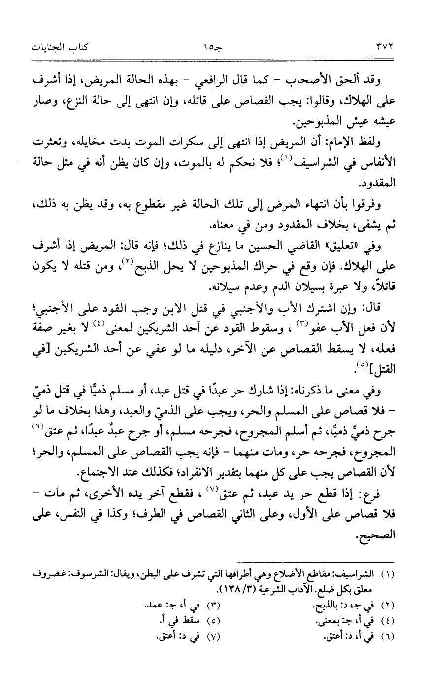 وقد ألحق الأصحاب – كما قال الرافعي – بهذه الحالة المريض، إذا أشرف على الهلاك، وقالوا: يجب القصاص على قاتله، وإن انتهى إلى حالة النزع، وصار عيشه عيش المذبوحين.