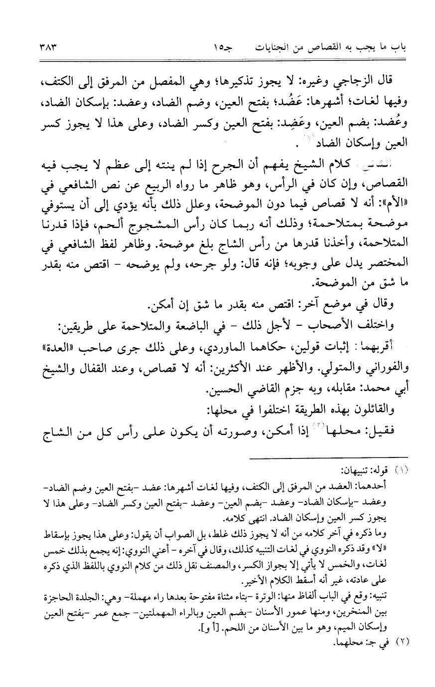 الثاني: كلام الشيخ يفهم أن الجرح إذا لم ينته إلى عظم لا يجب فيه القصاص، وإن كان في الرأس، وهو ظاهر ما رواه الربيع عن نص الشافعي في "الأم": أنه لا قصاص فيما دون الموضحة، وعلل ذلك بأنه يؤدي إلى أن يستوفي موضحة بمتلاحمة؛ وذلك أنه ربما كان رأس المشجوج ألحم، فإذا قدرنا المتلاحمة، وأخذنا قدرها من رأس الشاج بلغ موضحة. وظاهر لفظ الشافعي في المختصر يدل على وجوبه؛ فإنه قال: ولو جرحه، ولم يوضحه – اقتص منه بقدر ما شق من الموضحة.