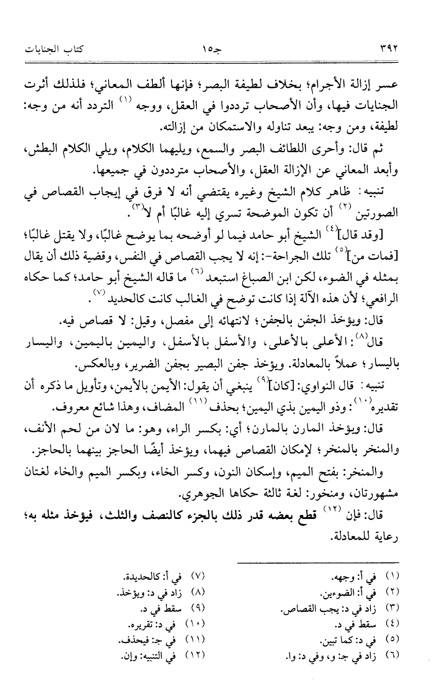 عسر إزالة الأجرام؛ بخلاف لطيفة البصر؛ فإنها ألطف المعاني؛ فلذلك أثرت الجنايات فيها، وأن الأصحاب ترددوا في العقل، ووجه التردد أنه من وجه: لطيفة، ومن وجه: يبعد تناوله والاستمكان من إزالته.