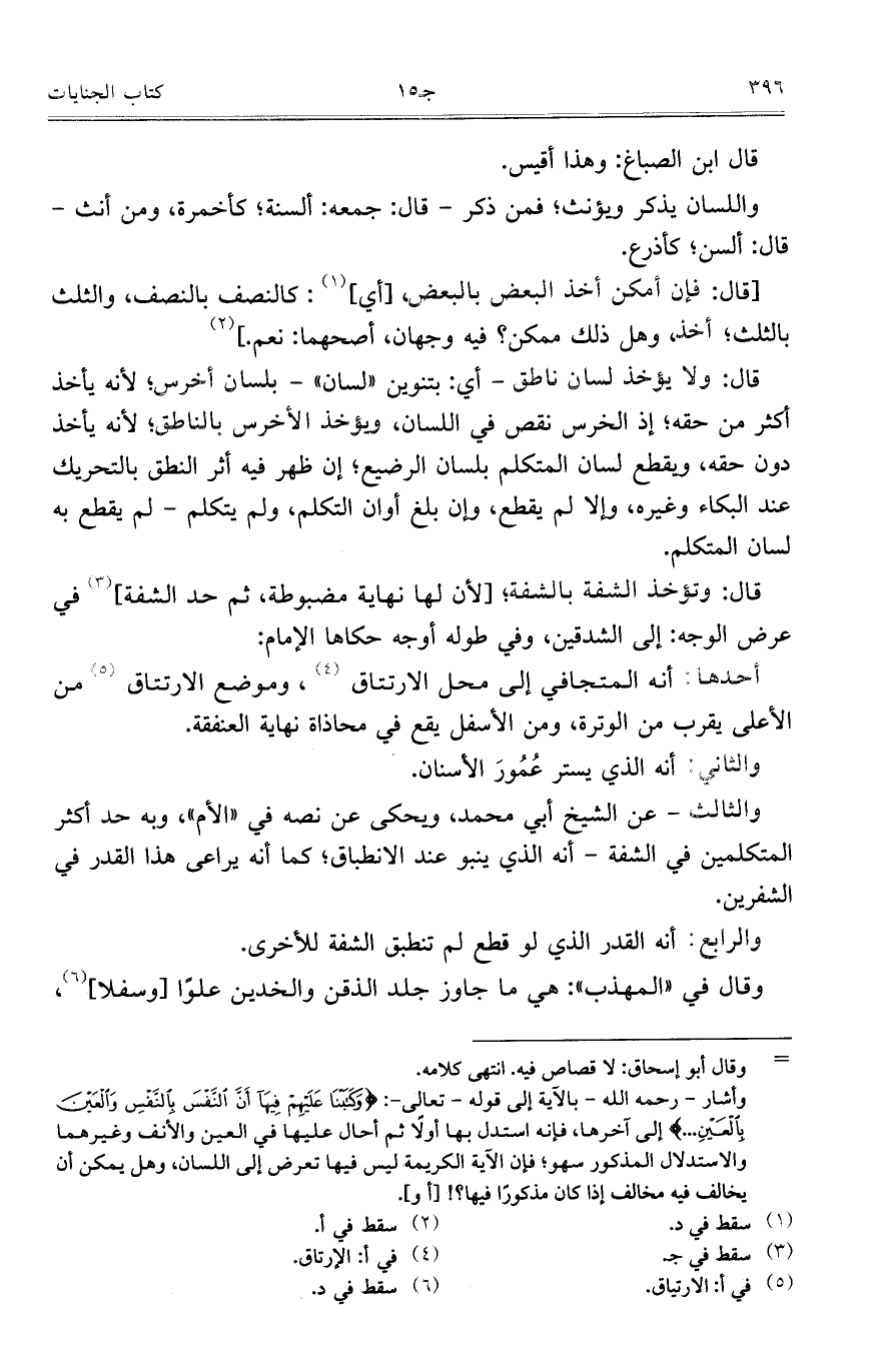 قال: ولا يؤخذ لسان ناطق –أي: بتنوين "لسان" – بلسان أخرس؛ لأنه يأخذ أكثر من حقه؛ غذ الخرس نقص في اللسان، ويؤخذ الأخرس بالناطق؛ لأنه يأخذ دون حقه، ويقطع لسان المتكلم بلسان الرضيع؛ إن ظهر فيه أثر النطق بالتحريك عند البكاء وغيره، وألا لم يقطع، وإن بلغ أوان التكلم، ولم يتكلم- لم يقطع به لسان المتكلم.